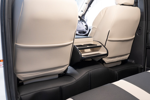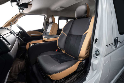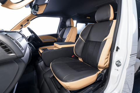 ノーマルタイプのカバーにはシート元の形状にピッタリとフィットするように設計。純正形状の使用感に高級レザーの触り心地がプラスされた使用感。ハイエースのシンプルなシート形状のままに贅沢な雰囲気を演出します。