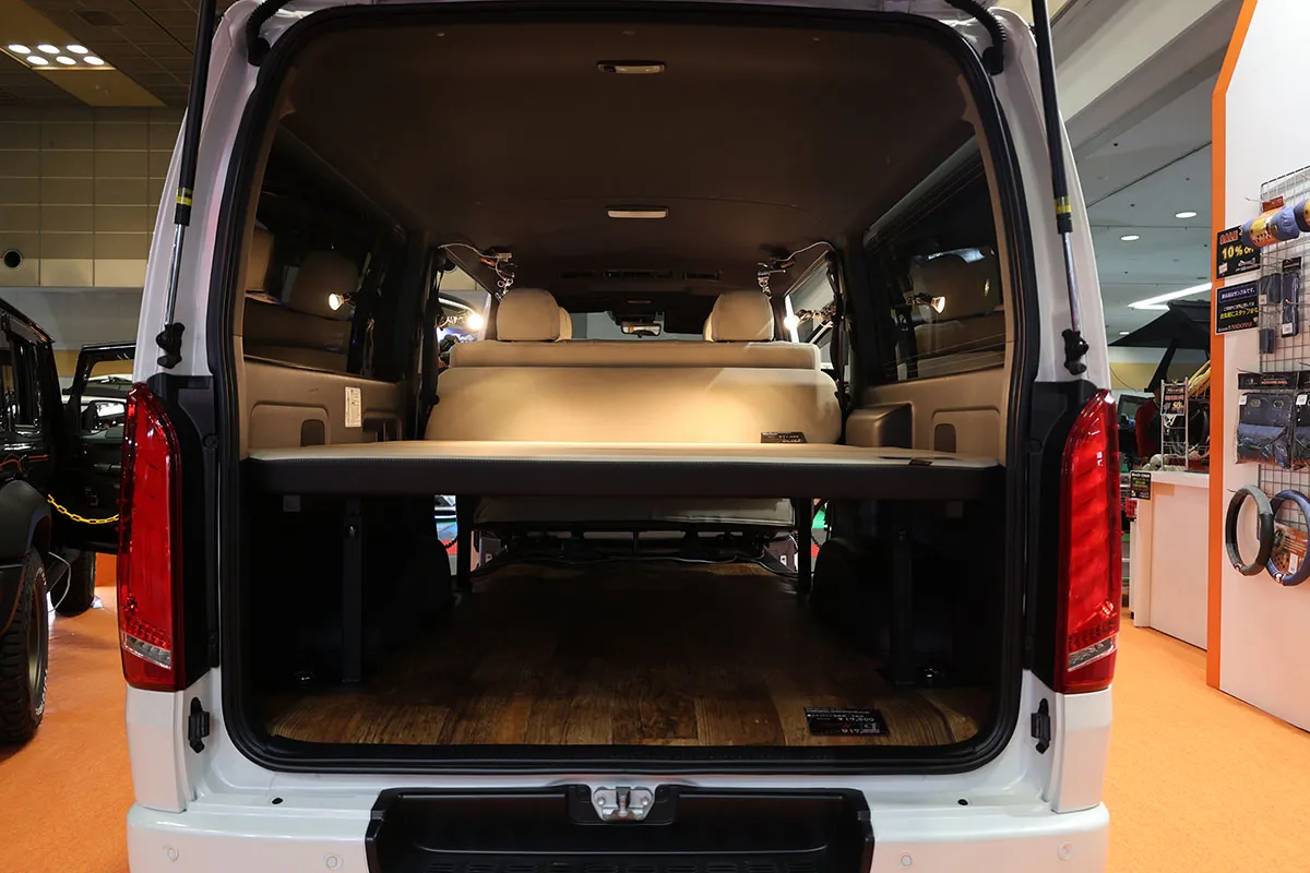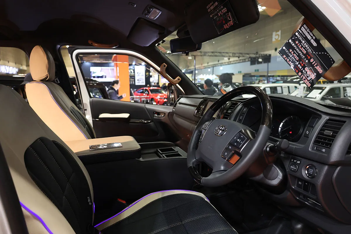 3台目には王道ハイエースです!会場には多様なカスタムハイエースが並んでおりましたが、今回は一味違った装いで参じました!