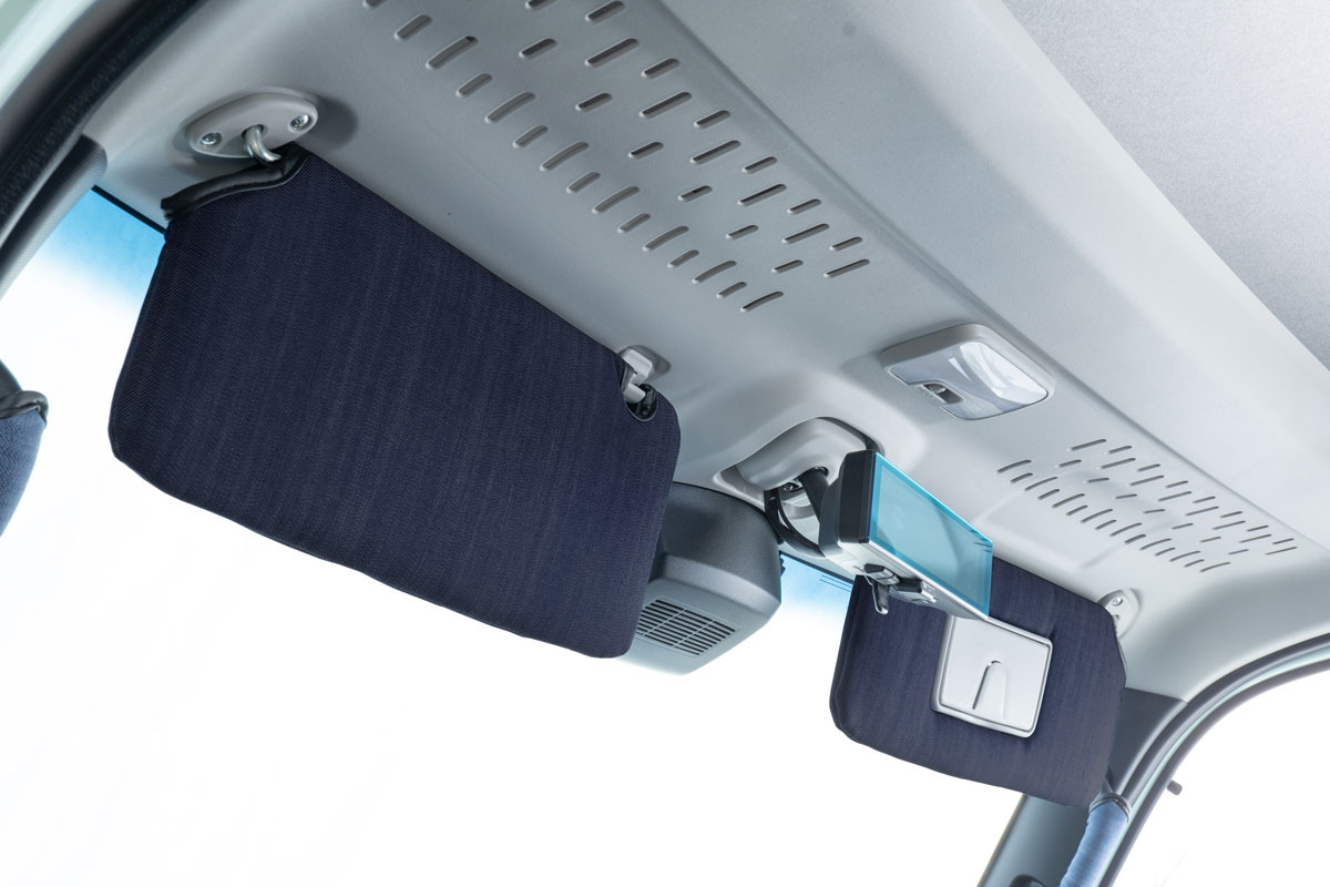| 装着 | 純正の無骨なサンバイザーをフルカバーし、インテリアに高級感を与えます。バニティミラー、チケットホルダーの使用はもちろん可能。装着はファスナー式で被せるだけでお楽しみいただけます。 |