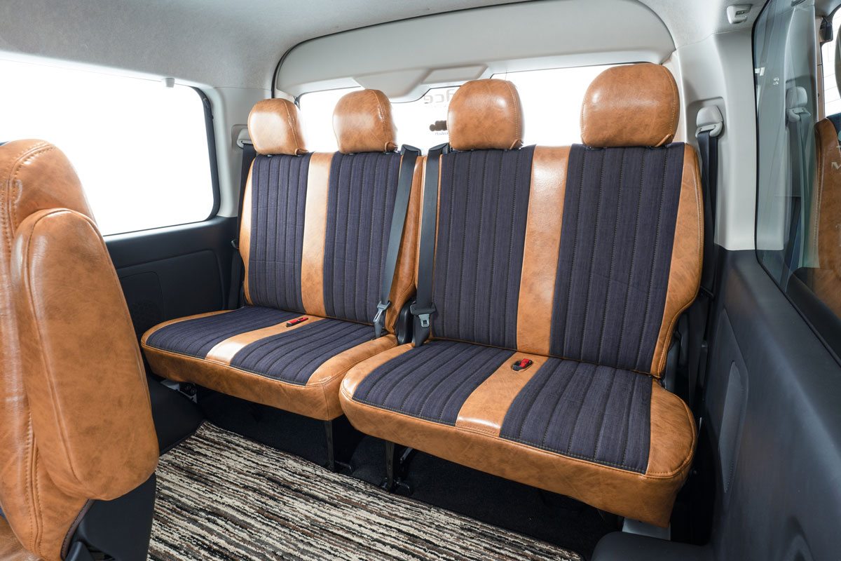 ハイエースワゴン後部座席に装着したアンティークデニムインディゴ アンティークキャメルカラー。