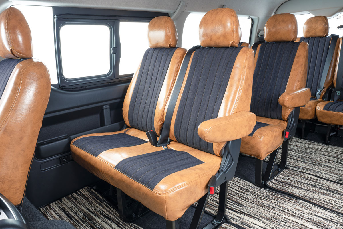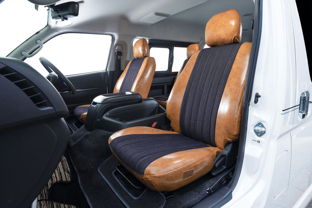 ハイエースワゴン前席に装着したアンティークデニム アンティークキャメルカラー。