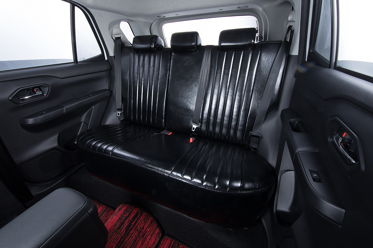 デリカミニ後部座席に装着したアンティークデザインS キャメル。特徴的なシート形状にも綺麗にフィットします。