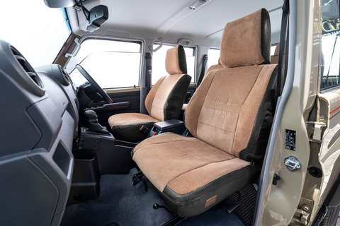 125系ハイラックス後部座席に装着したアンティークデザインS キャメルカラー。シート中央のドリンクホルダーにも標準仕様でカバーを設定しています。