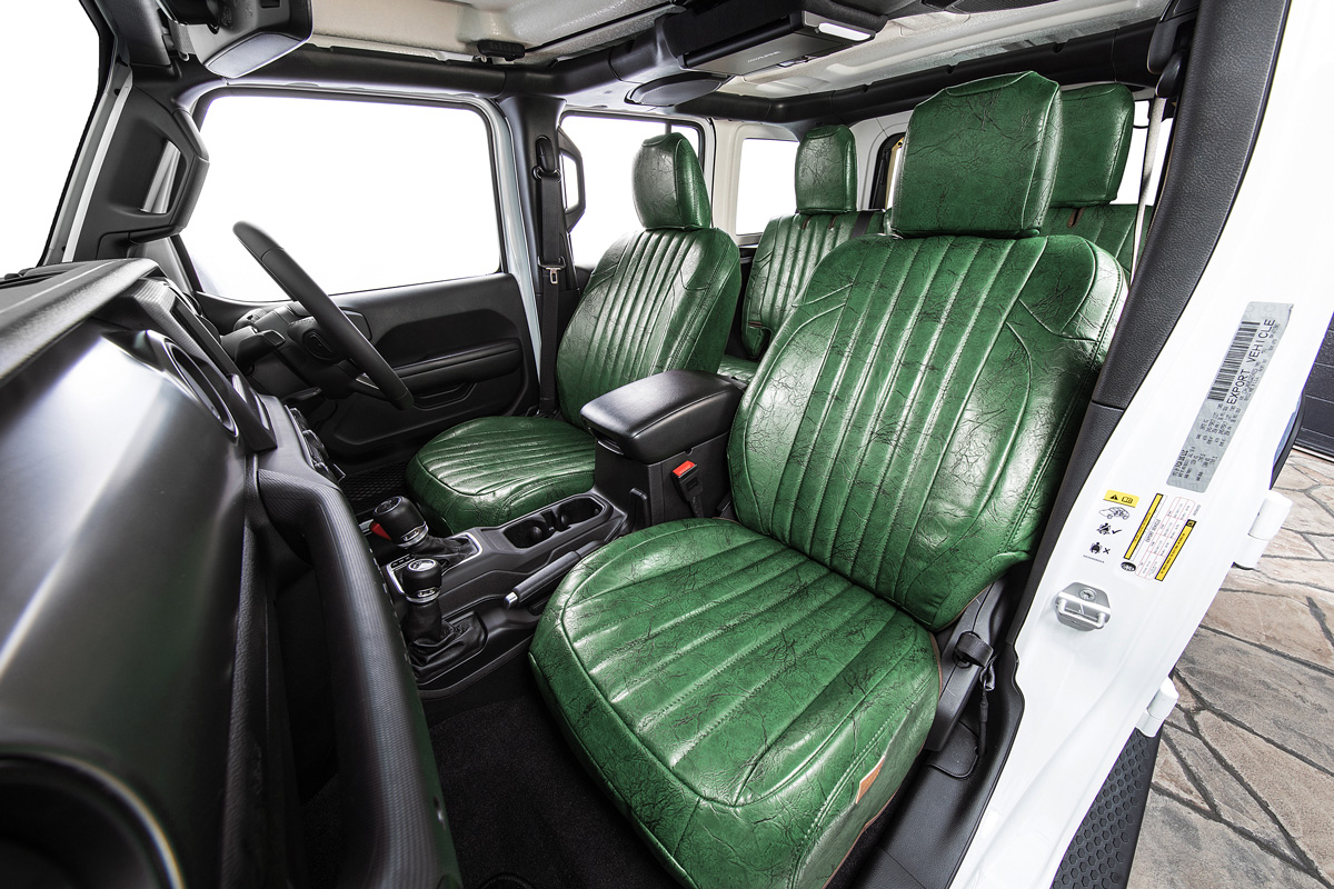 JEEP ラングラーに装着したアンティークデザインS キャメルカラー。後部座席装着イメージ。