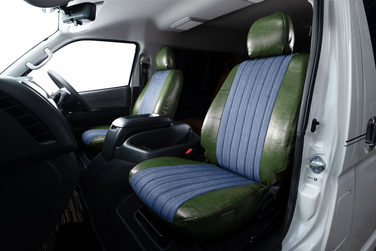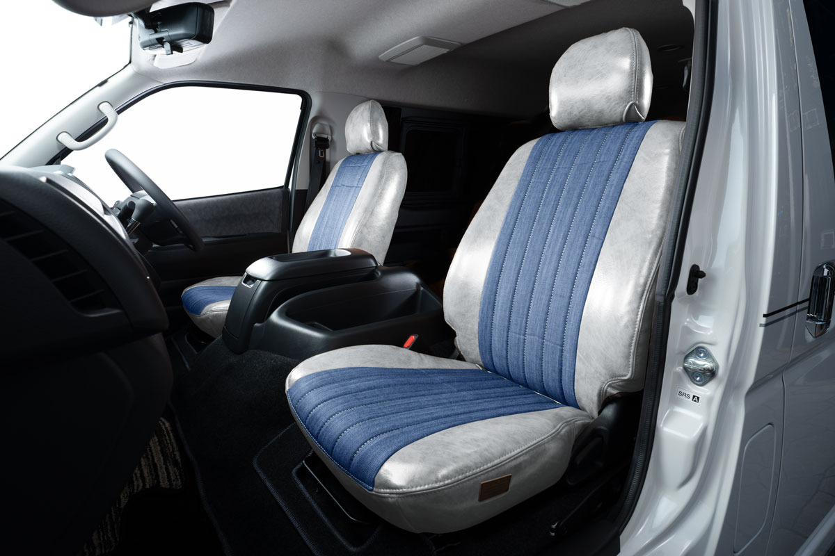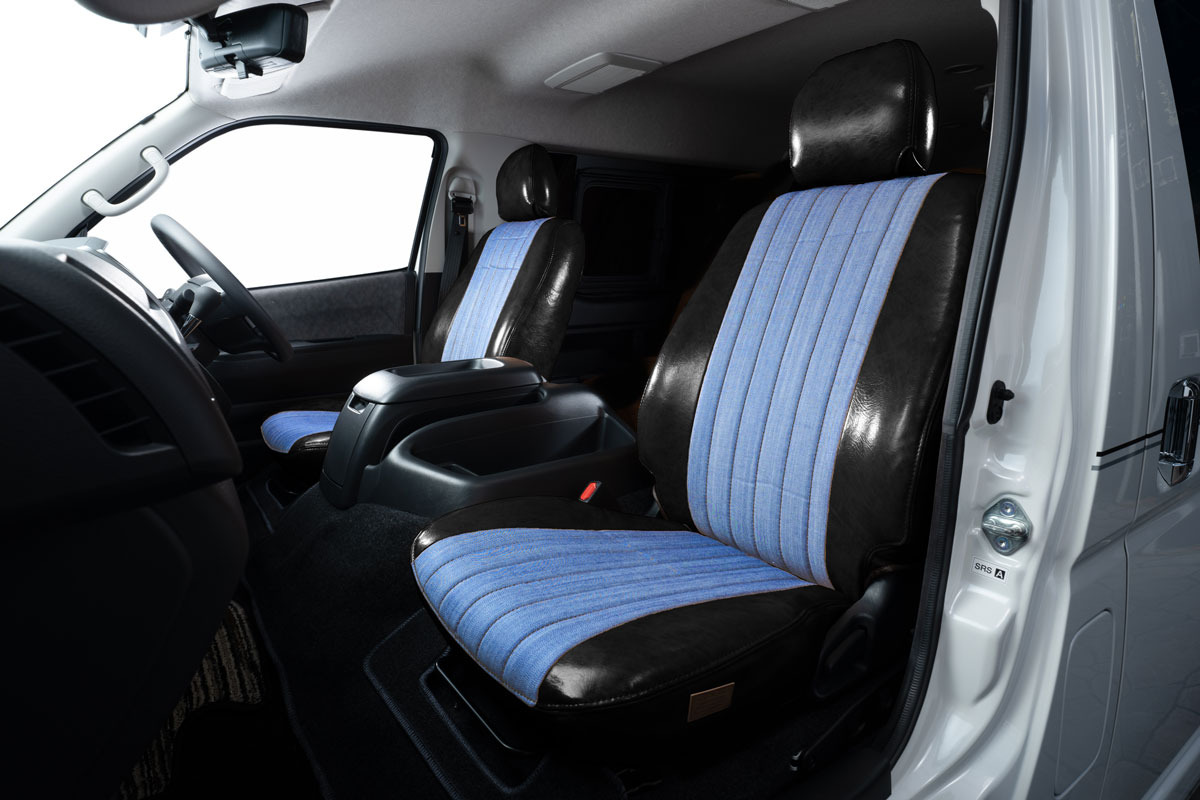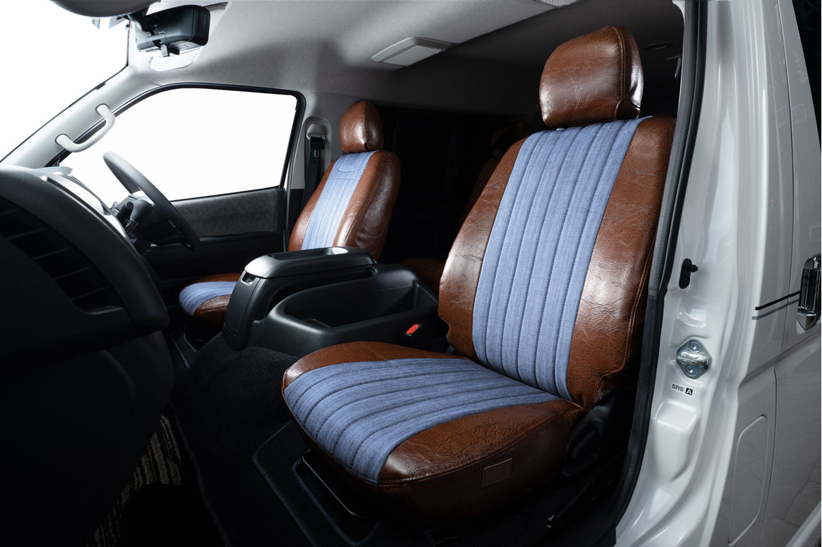 ハイエースワゴン前席に装着したアンティークデニム アンティークキャメルカラー。