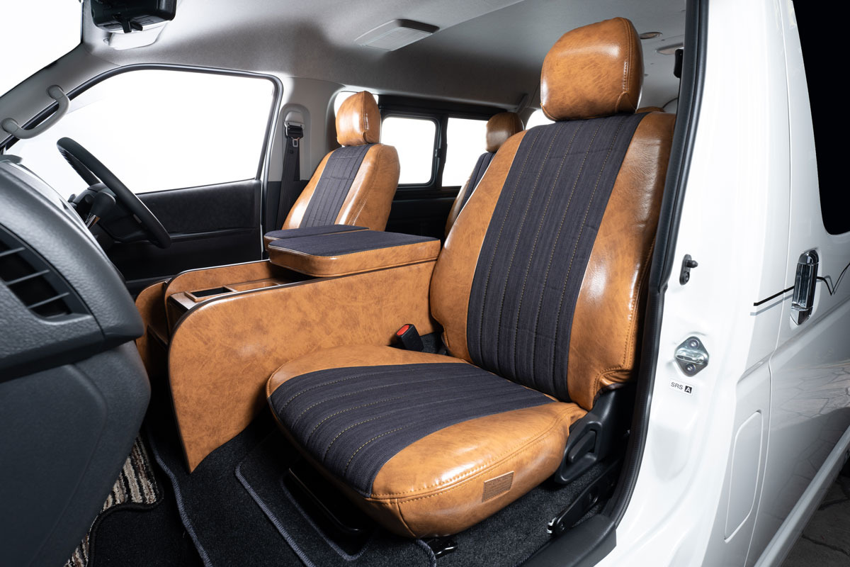 200系ハイエースバンに装着したキャメルカラー。インディゴブルーとの組み合わせがバランスよくまとまったデザイン。