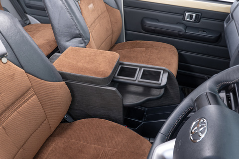125系ハイラックス後部座席に装着したアンティークデザインS キャメルカラー。シート中央のドリンクホルダーにも標準仕様でカバーを設定しています。