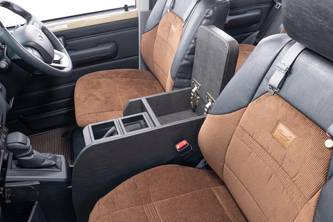 アームレストがある車種にはアームレストにも専用設計のカバーが付属します。(※画像のジムニーには別売のアームレストを装着しています。アームレストカバーも別売となっています。)