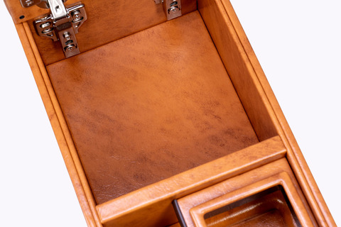 従来のブラウンカラーは、明るめの茶色地に、革しぼの質感は暗い色合い。ヴィンテージブラウンカラーは、暗い茶色地に、革しぼは明るい色合い。使い込んでマットな質感になった革を思わせる素材感。通常ブラウンカラーよりヴィンテージ感のある素材となっています。