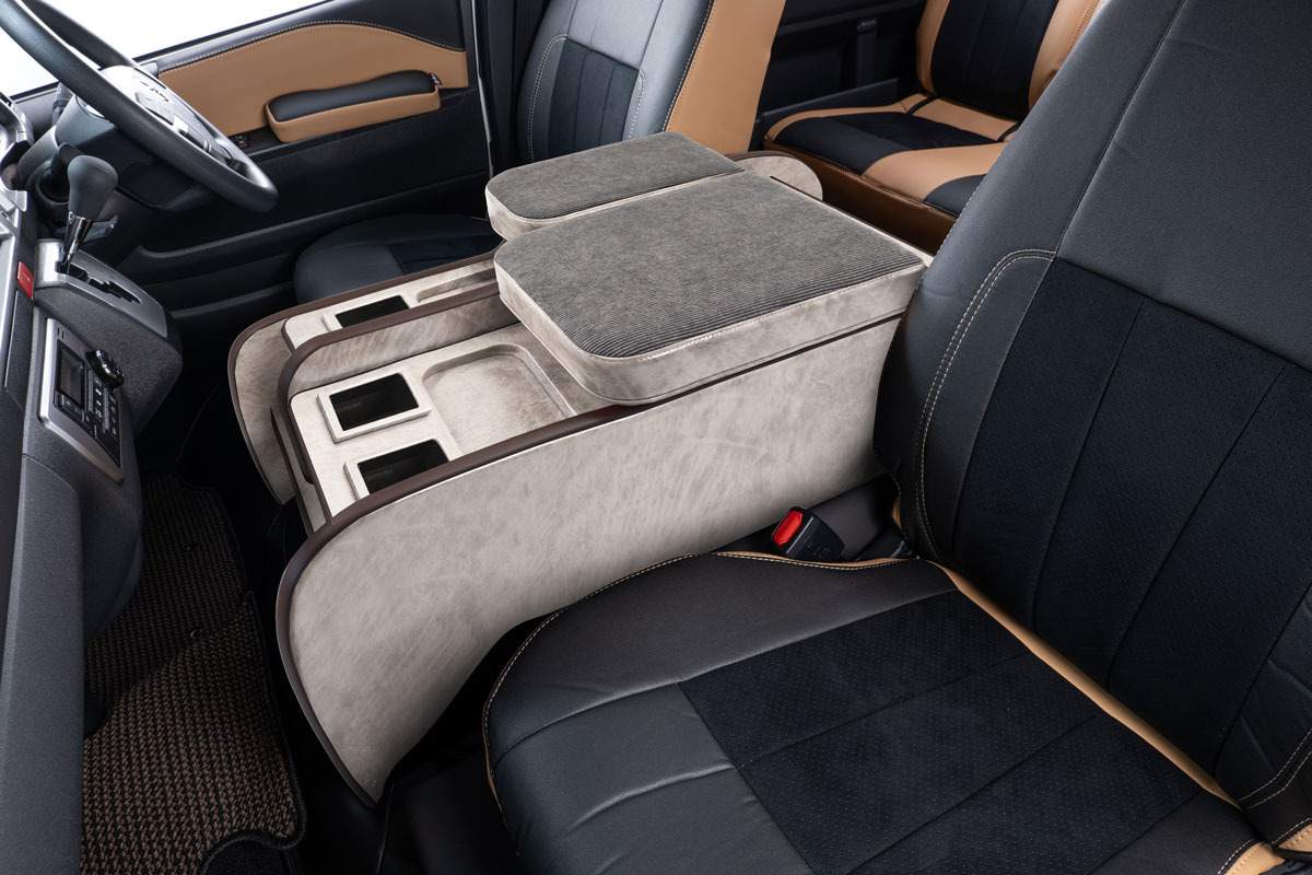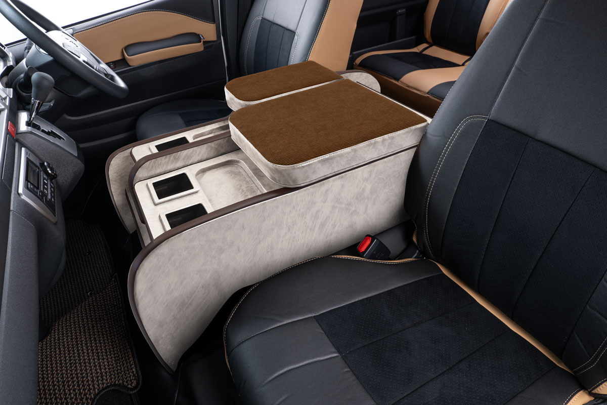 収納の蓋の役目を担ったアームレストは運転席助手席ともに使用可能で、天面にはウレタンクッションを内包。肘を置いたときの使い心地に配慮した設計です。