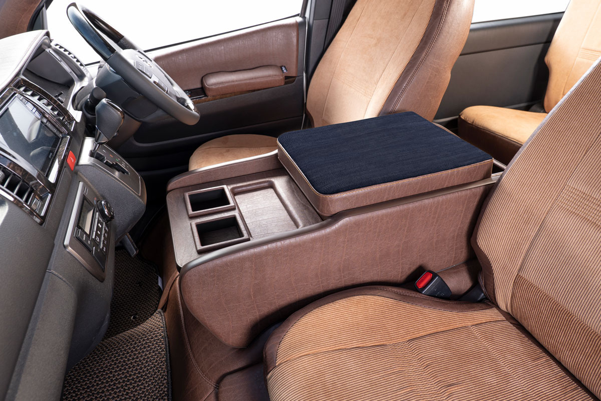 収納の蓋の役目を担ったアームレストは運転席助手席ともに使用可能で、天面にはウレタンクッションを内包。肘を置いたときの使い心地に配慮した設計です。