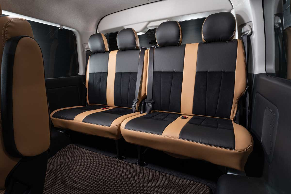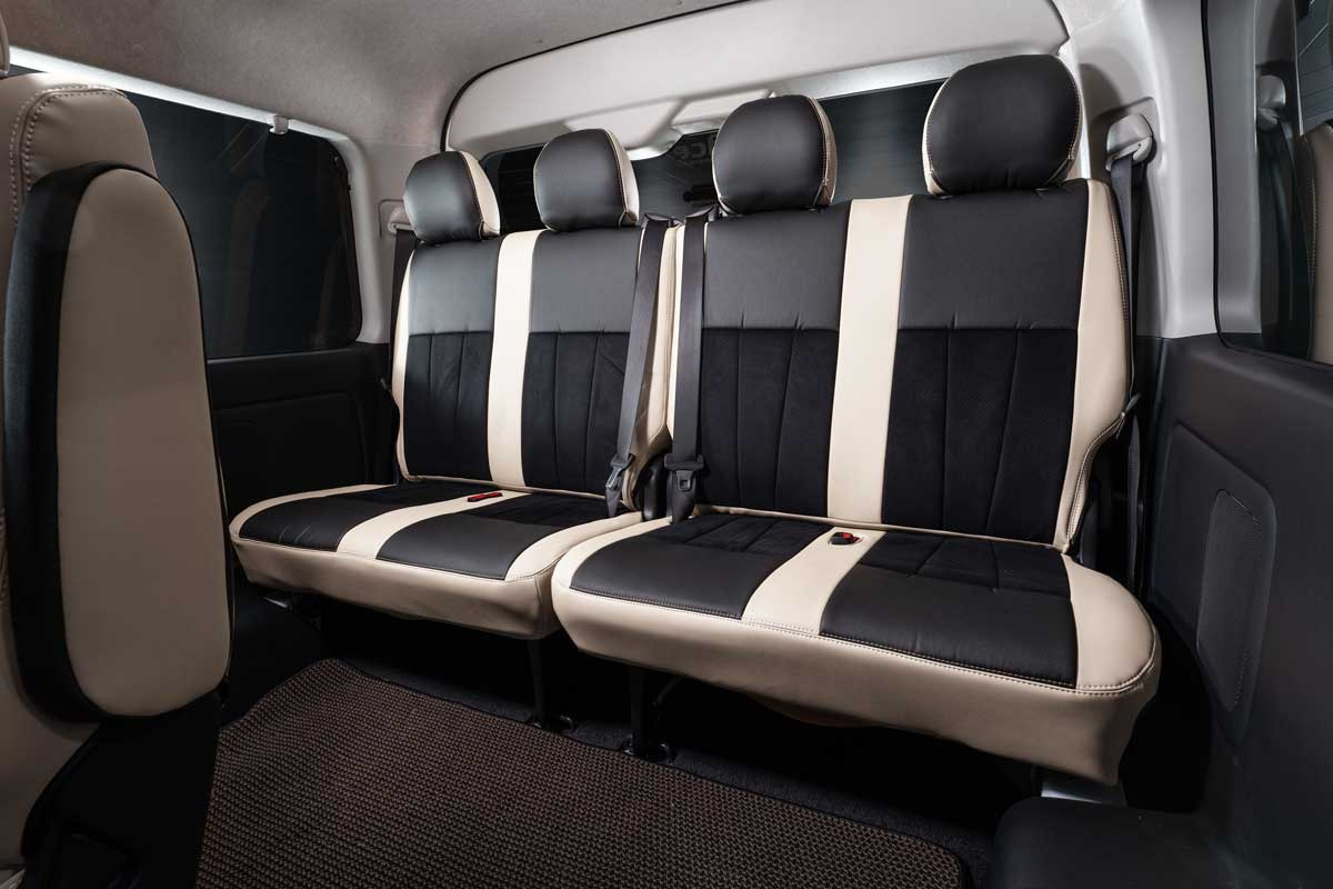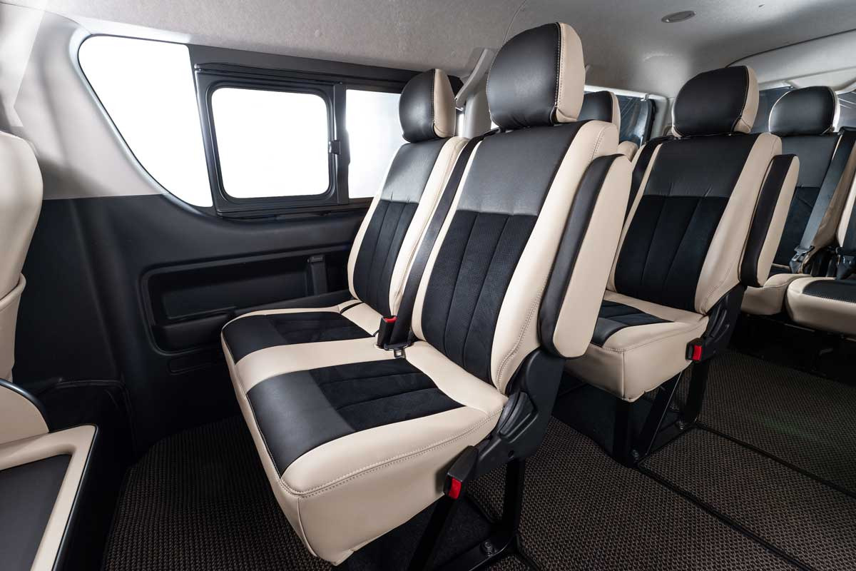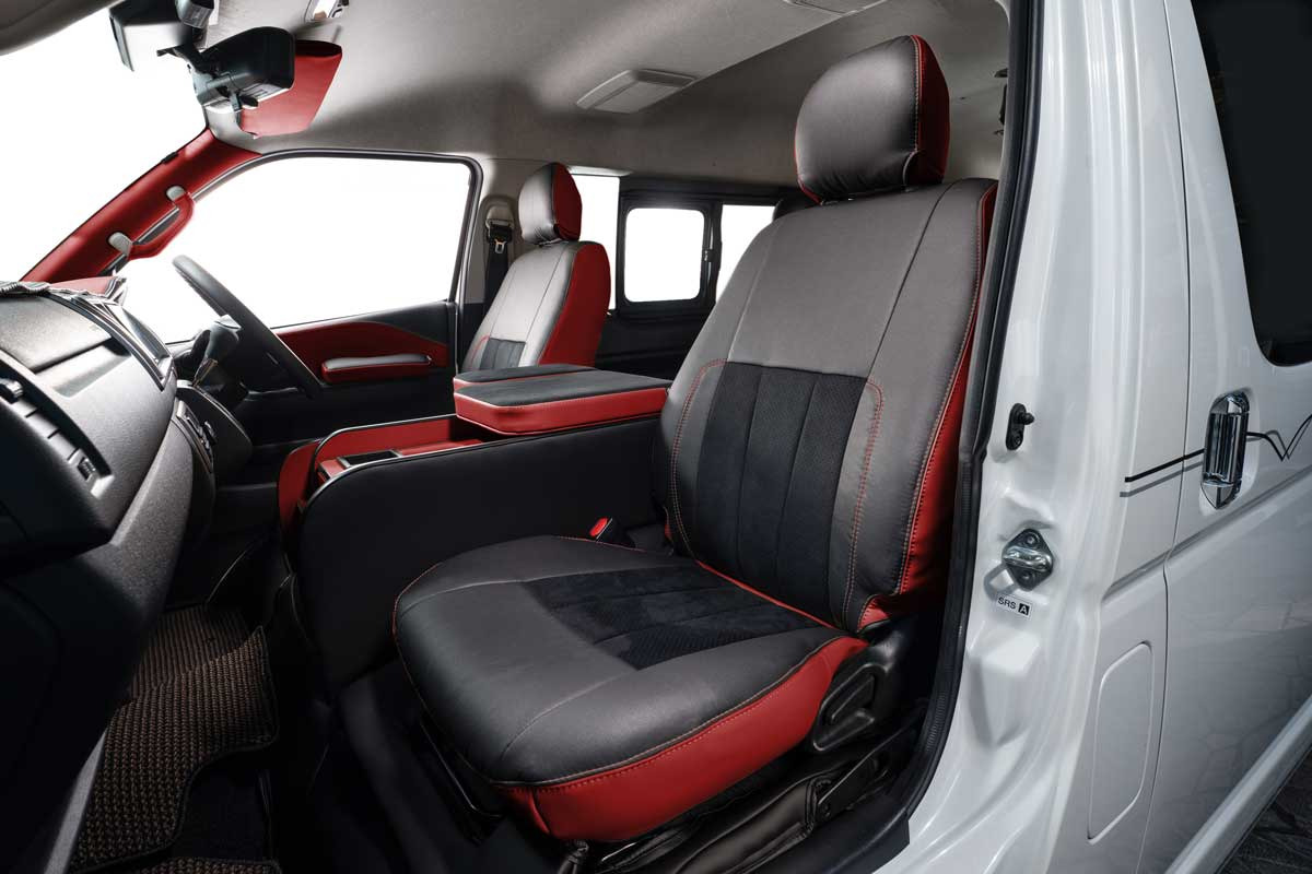 ノーマルタイプのカバーにはシート元の形状にピッタリとフィットするように設計。純正形状の使用感に高級レザーの触り心地がプラスされた使用感。ハイエースのシンプルなシート形状のままに贅沢な雰囲気を演出します。