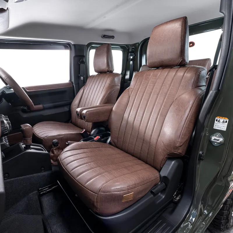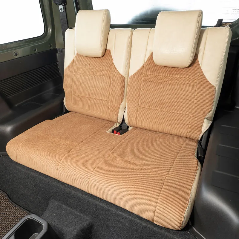 ジムニーに装着したアンティークカントリー クラシックアイボリー×コーデュロイキャメル 2列目。一体型の座席部分にもしっかりフィットした設計。