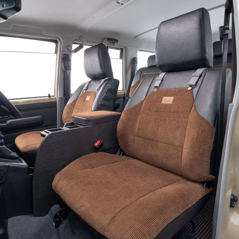 ランドクルーザー70に装着したアンティークカントリー クラシックブラック×コーデュロイブラウン×ベルトグレー 1列目。