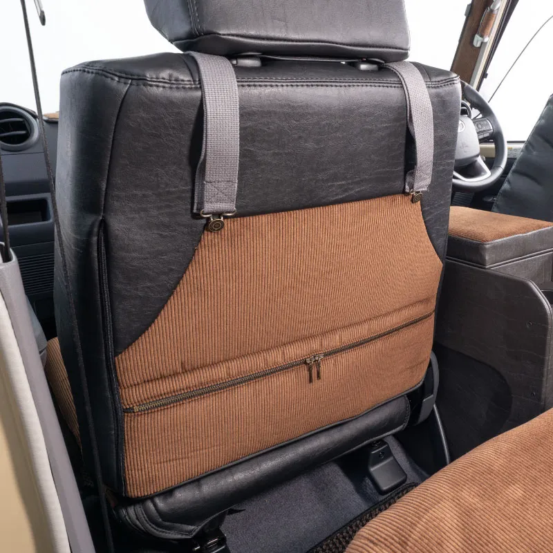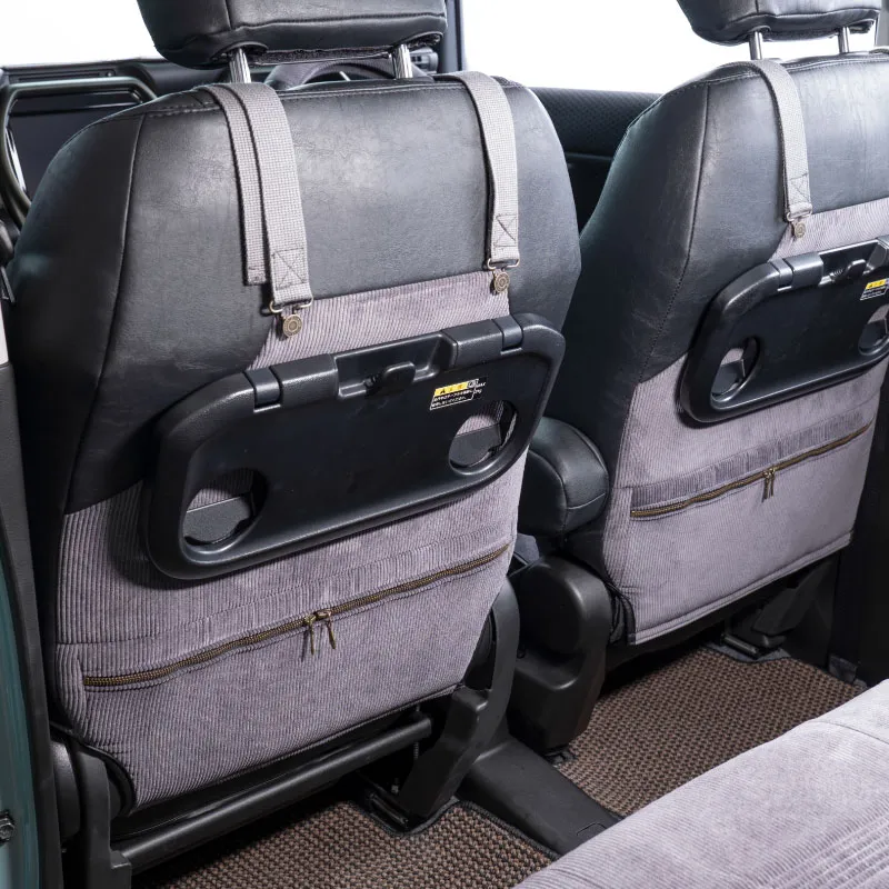 ランドクルーザー70に装着したアンティークカントリー クラシックブラック×コーデュロイブラウン×ベルトグレー 1列目の背面にはファスナー付きポケットがついています。