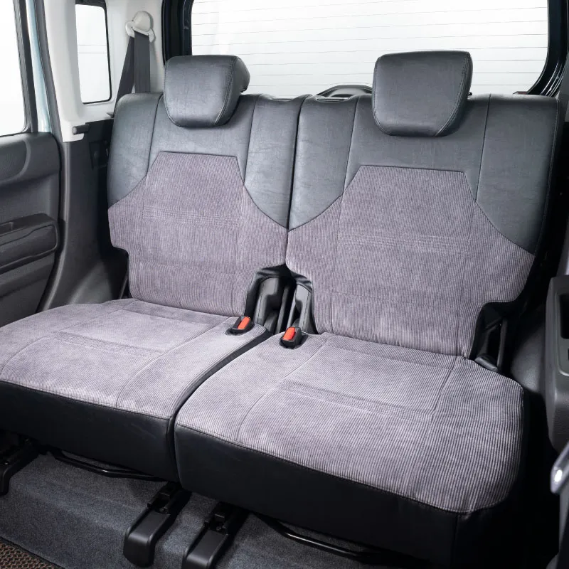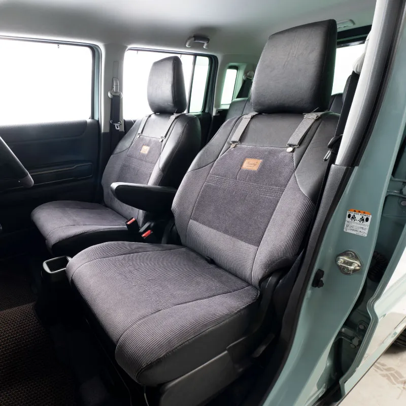ハスラーに装着したアンティークカントリー クラシックブラック×コーデュロイグレー 後部座席にもコーデュロイがフィットします。