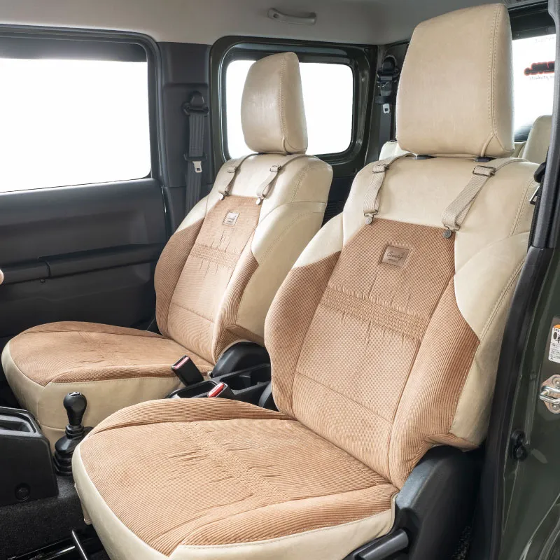ジムニーに装着したアンティークカントリー クラシックアイボリー×コーデュロイキャメル×ベルトベージュ アイボリーとキャメルの組み合わせで車内を可愛く。