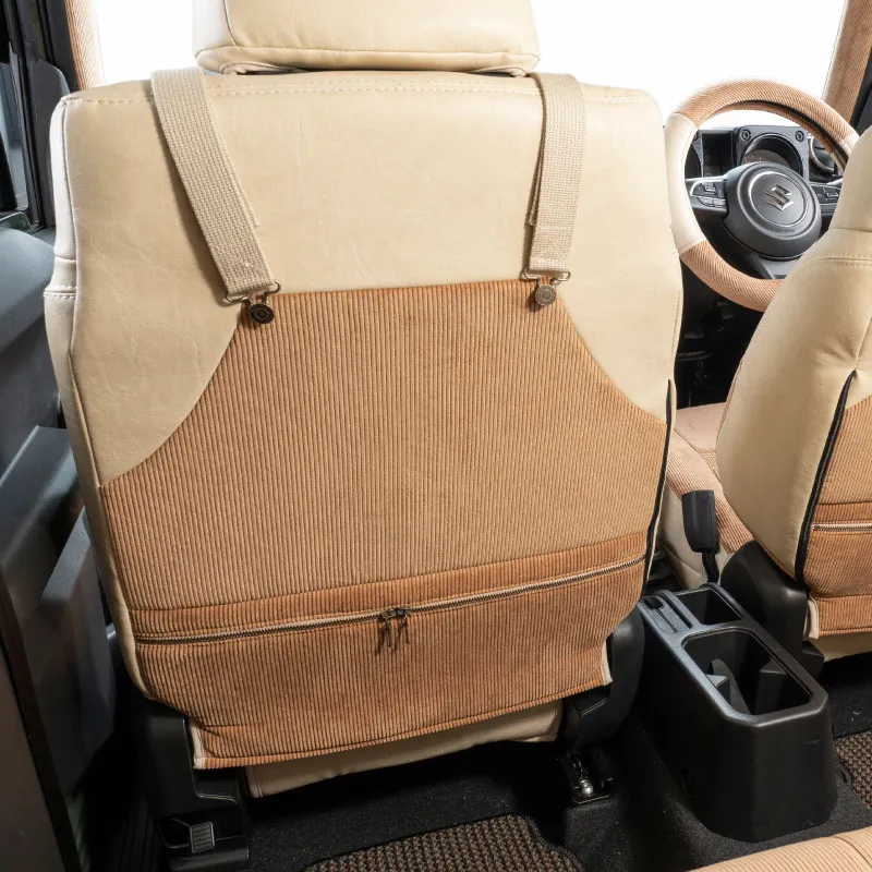 ジムニーに装着したアンティークカントリー クラシックアイボリー×コーデュロイキャメル×ベルトベージュ 1列目背面。