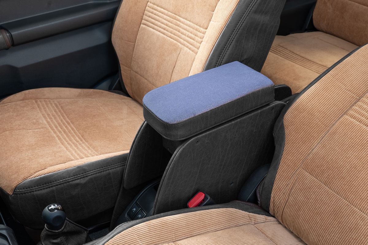 こだわりの一品。市販の汎用品では叶わなかったフィット感とインテリアスタイルの統一感を実現するため、ジムニー専用設計で開発しました。使いやすさとお洒落さを両立した、大人のジムニーカスタムアイテムです。製品紹介。-グレイスのシートカバーと完璧なトータルコーディネート-シートカバー同様、オーダーメイドスタイルでご注文いただけるので、車内全体のトータルコーディネートをお楽しみいただけます。様々なデザインとカラーの組み合わせが可能です。グレイスならではの幅広いデザインをお客様のスタイルでお楽しみください!-選べる構造デザイン&しっかり収納-ジムニーの様々な利用シーンや生活スタイルに合わせてお選びいただける2種のデザインを用意しました!スマホが収納できるサイズの小物入れを設定。後部座席側には標準仕様と同様に、ドリンクホルダーを2ヶ所確保。 Ver.1 収納スペース。肘置き下に小物入れスペースがあります。