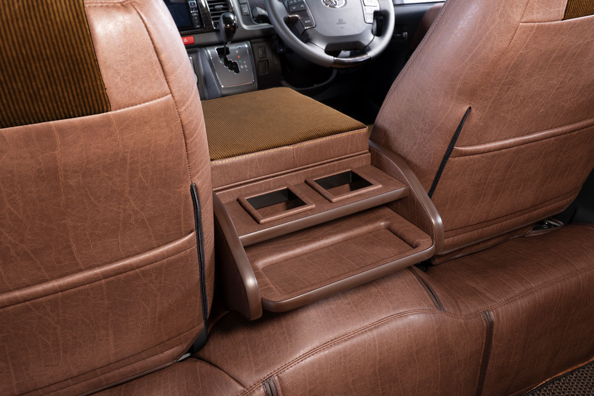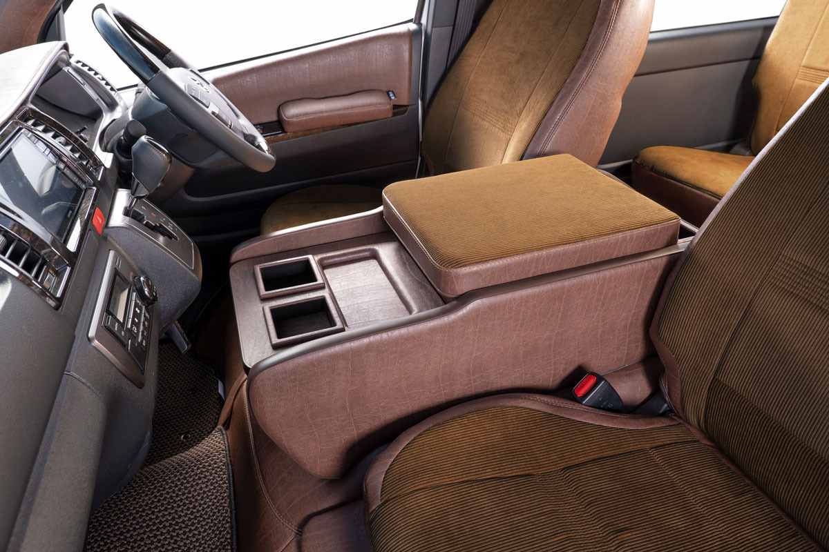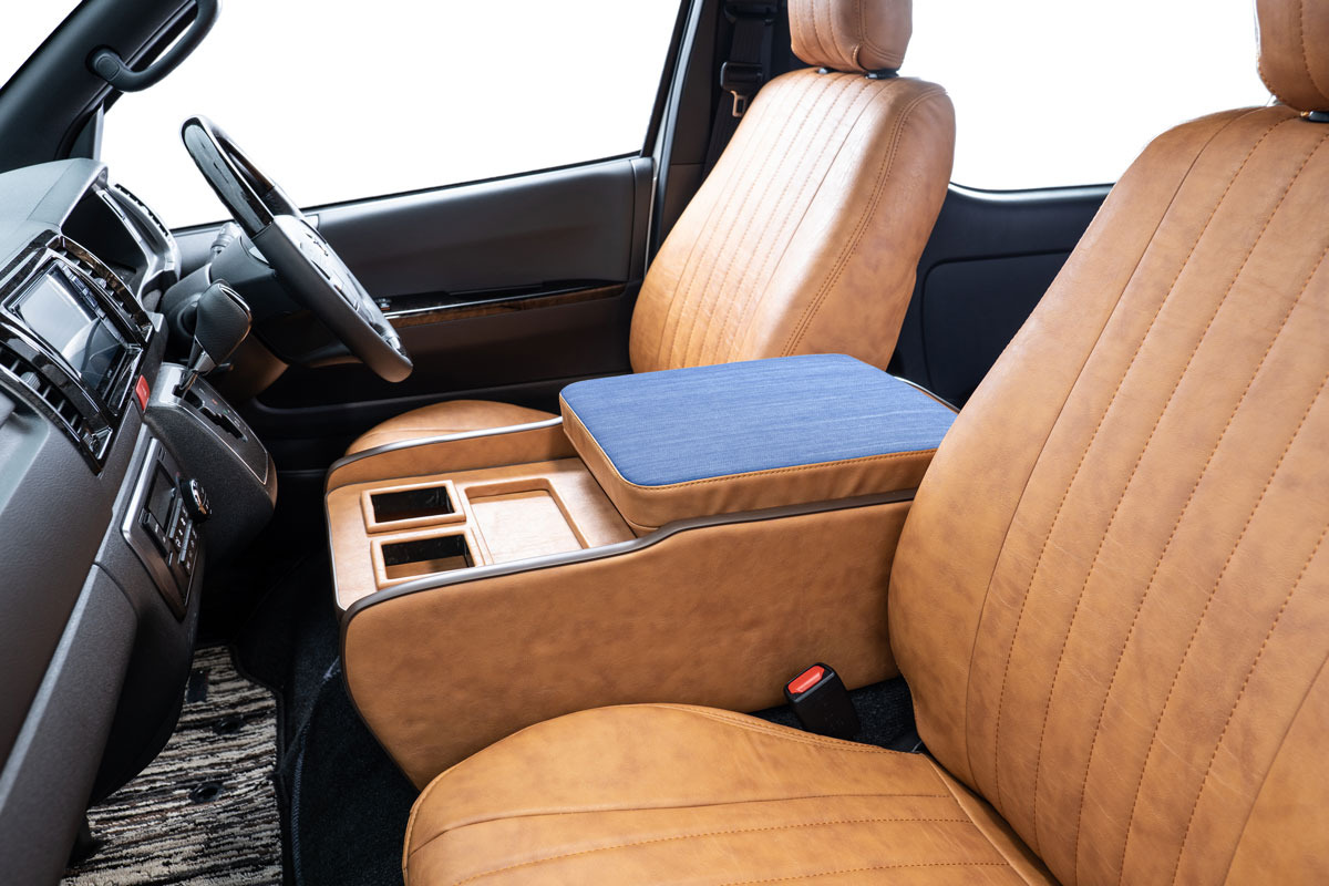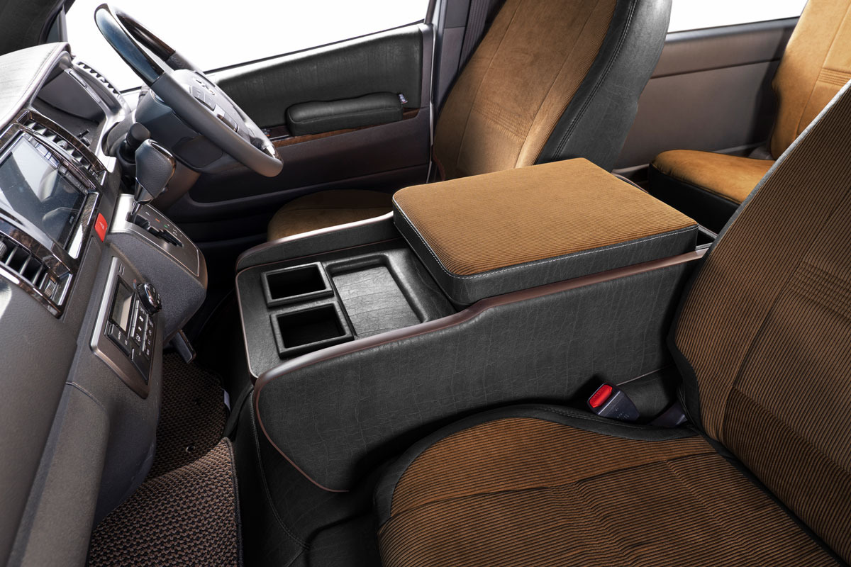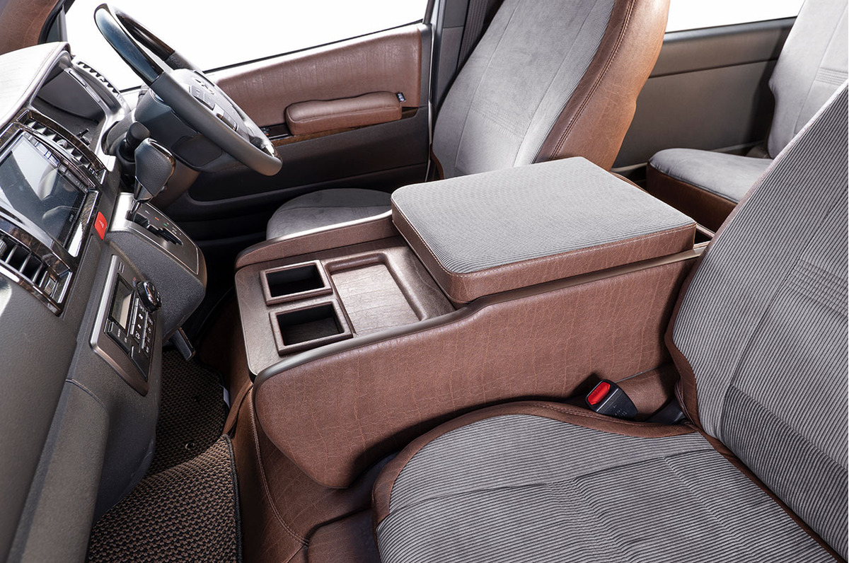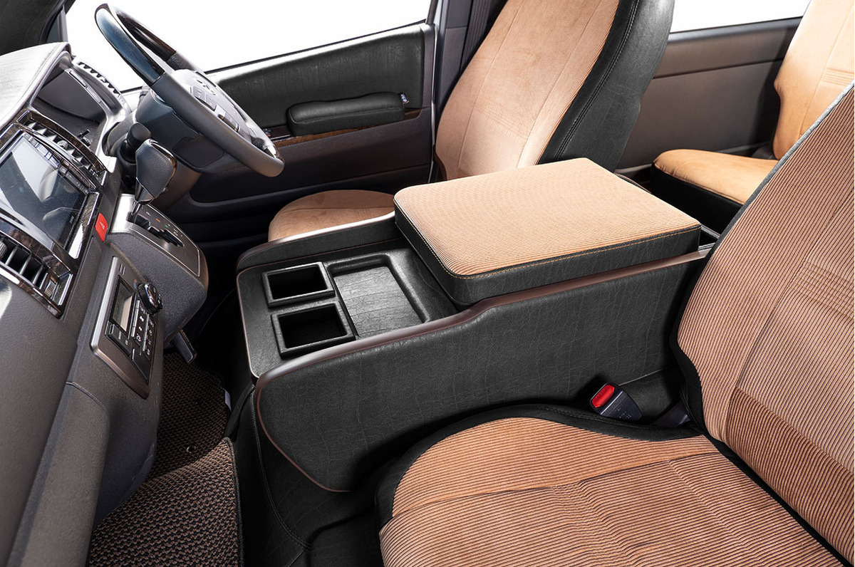 収納の蓋の役目を担ったアームレストは運転席助手席ともに使用可能で、天面にはウレタンクッションを内包。肘を置いたときの使い心地に配慮した設計です。