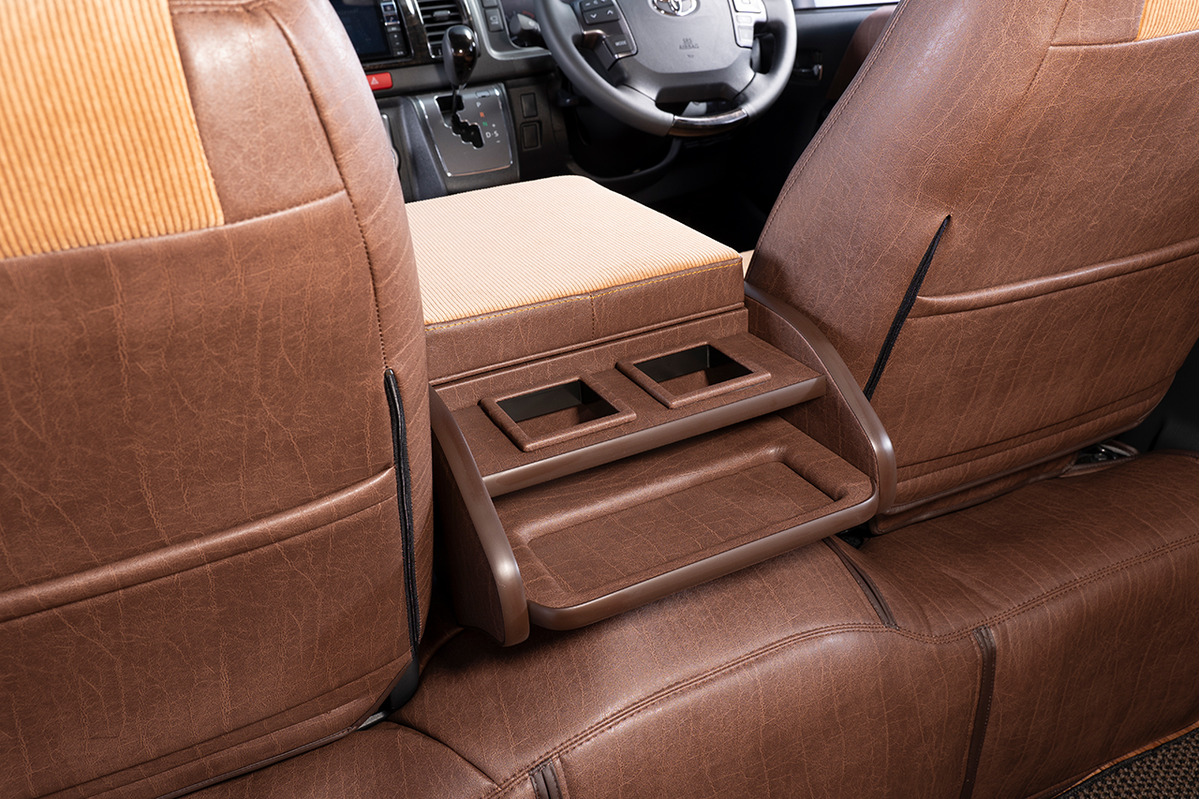 純正コンソールに用意されたドリンクホルダー2箇所に加え、小物トレーを追加設計しました。