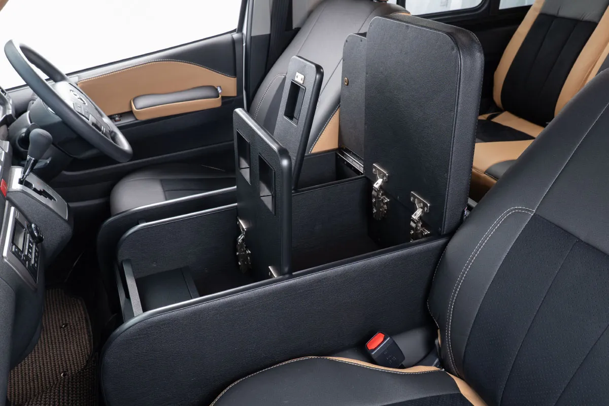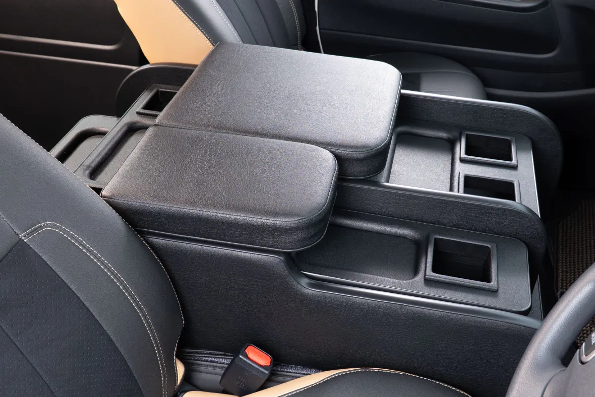 収納の蓋の役目を担ったアームレストは運転席助手席ともに使用可能で、天面にはウレタンクッションを内包。肘を置いたときの使い心地に配慮した設計です。