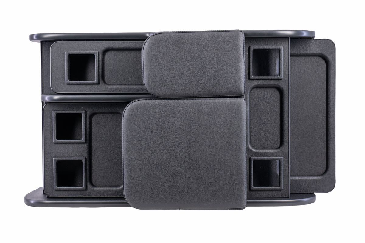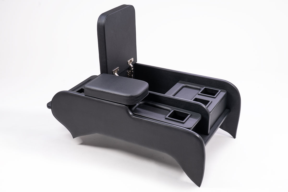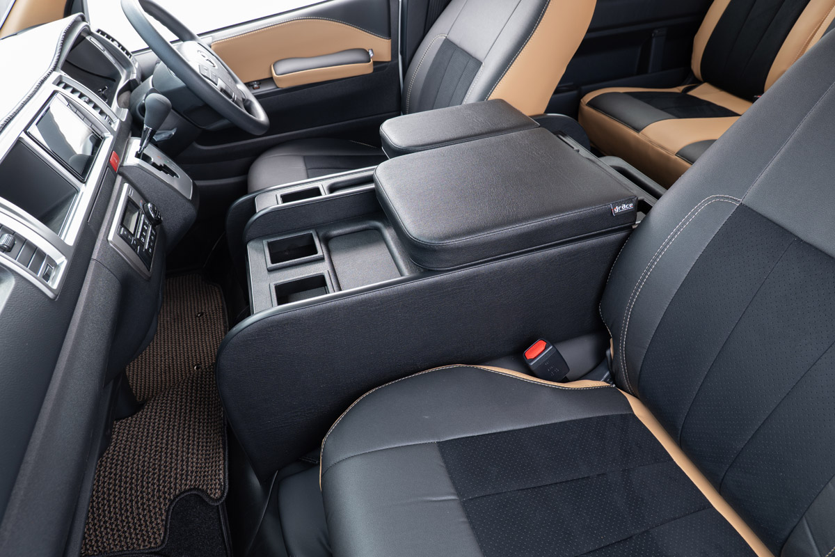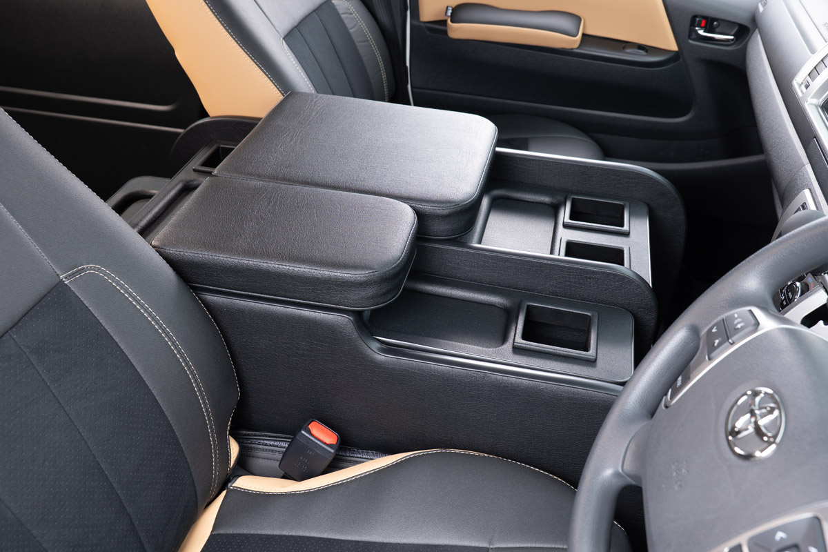 収納の蓋の役目を担ったアームレストは運転席助手席ともに使用可能で、天面にはウレタンクッションを内包。肘を置いたときの使い心地に配慮した設計です。