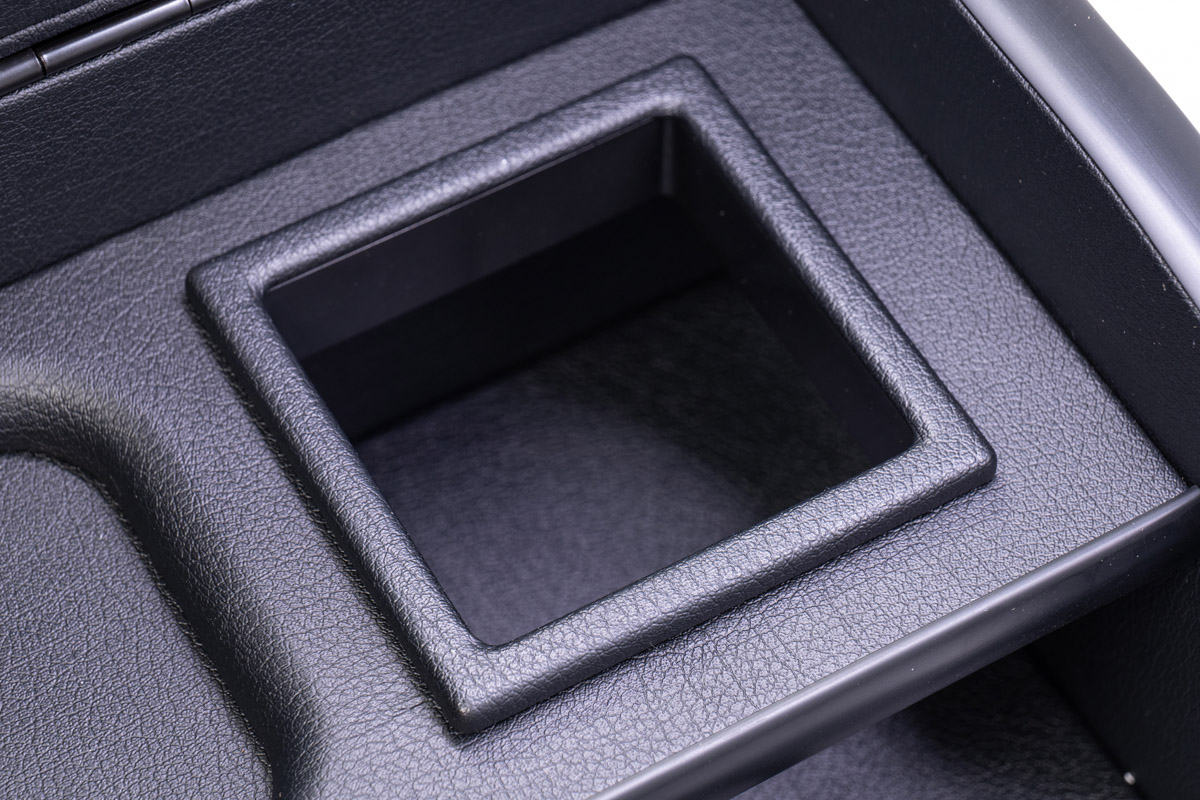 純正コンソールに用意されたドリンクホルダー2箇所に加え、小物トレーを追加設計しました。