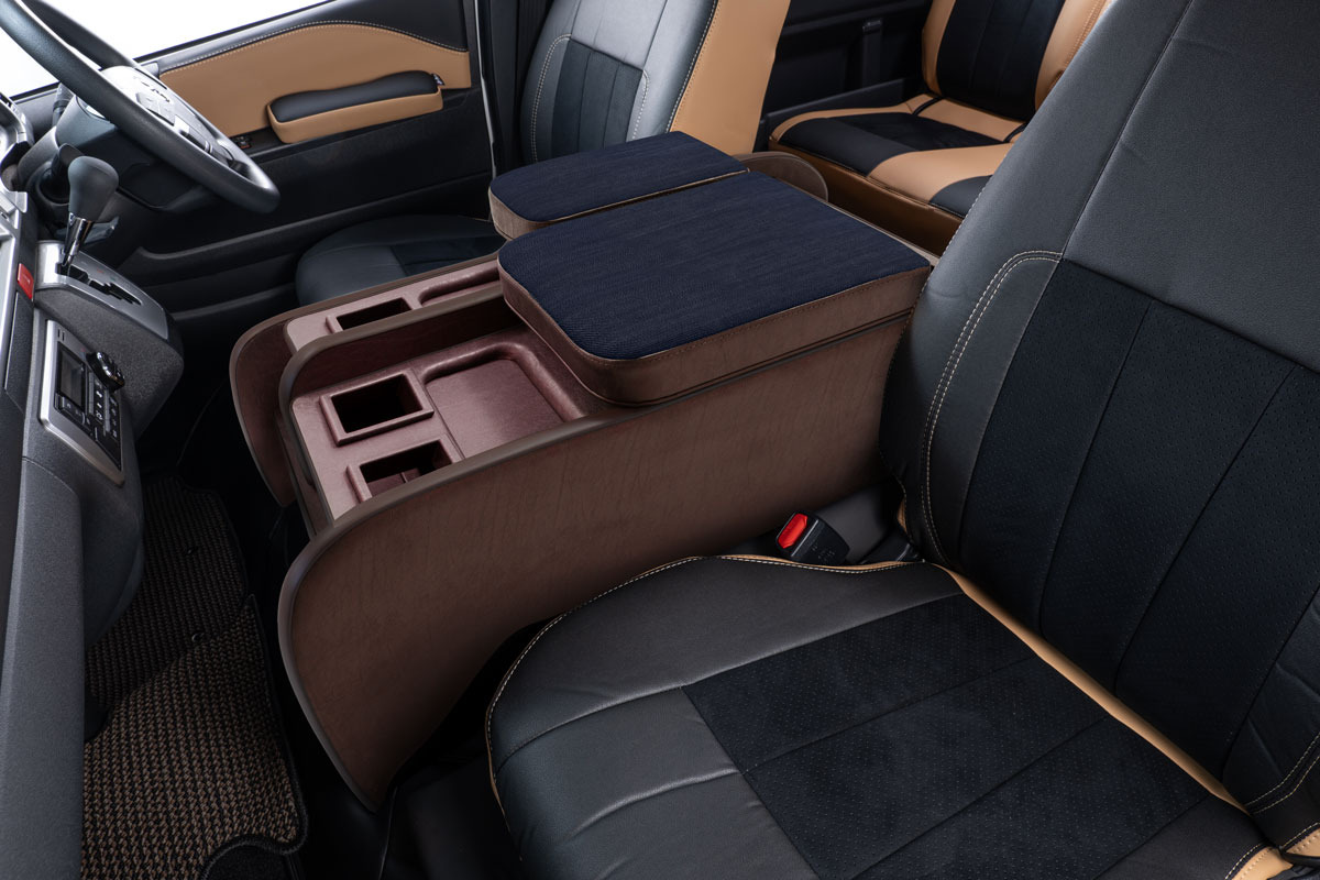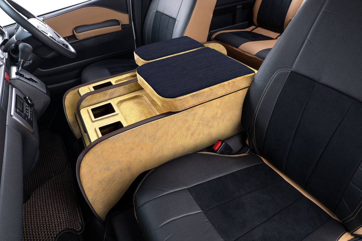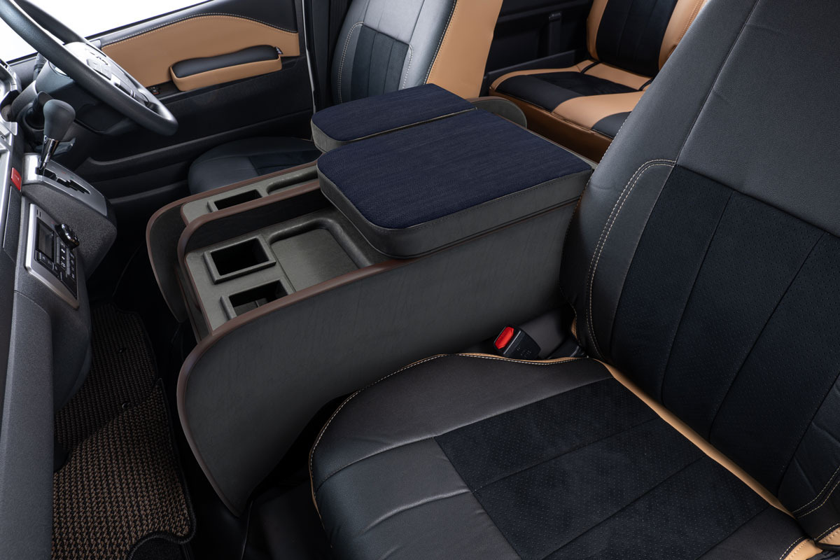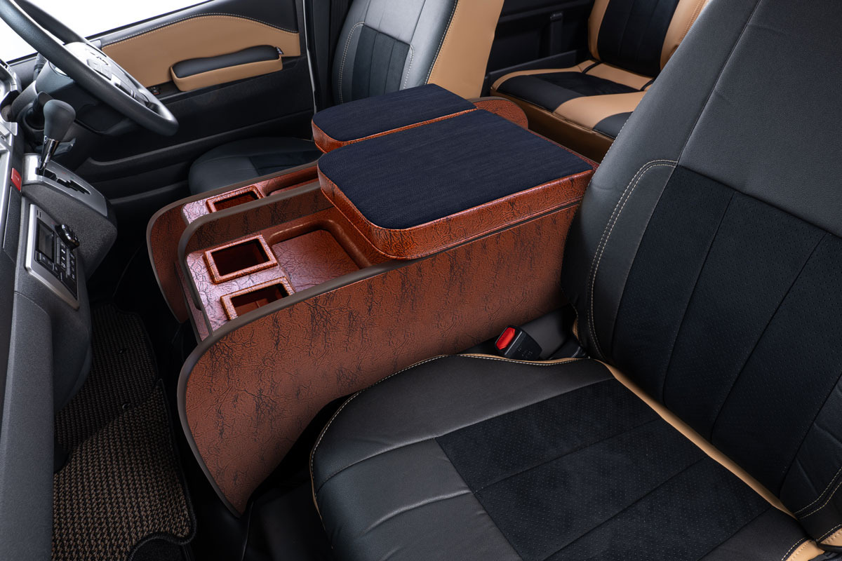 ハイエース用のシートカバープライムシリーズと一緒に装着されているセンターコンソールプライム。 ハイエース用のシートカバープライムシリーズと一緒に装着されているセンターコンソールプライム。