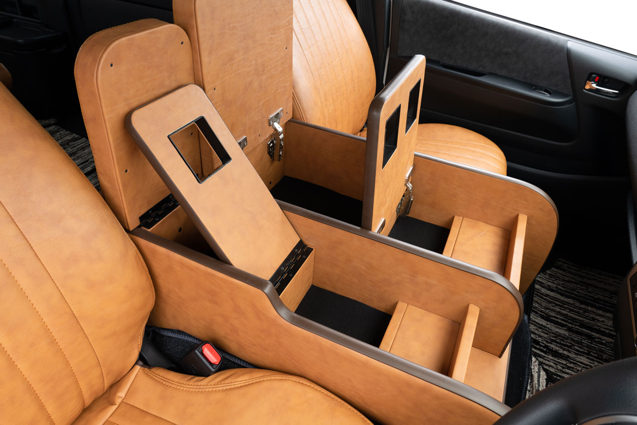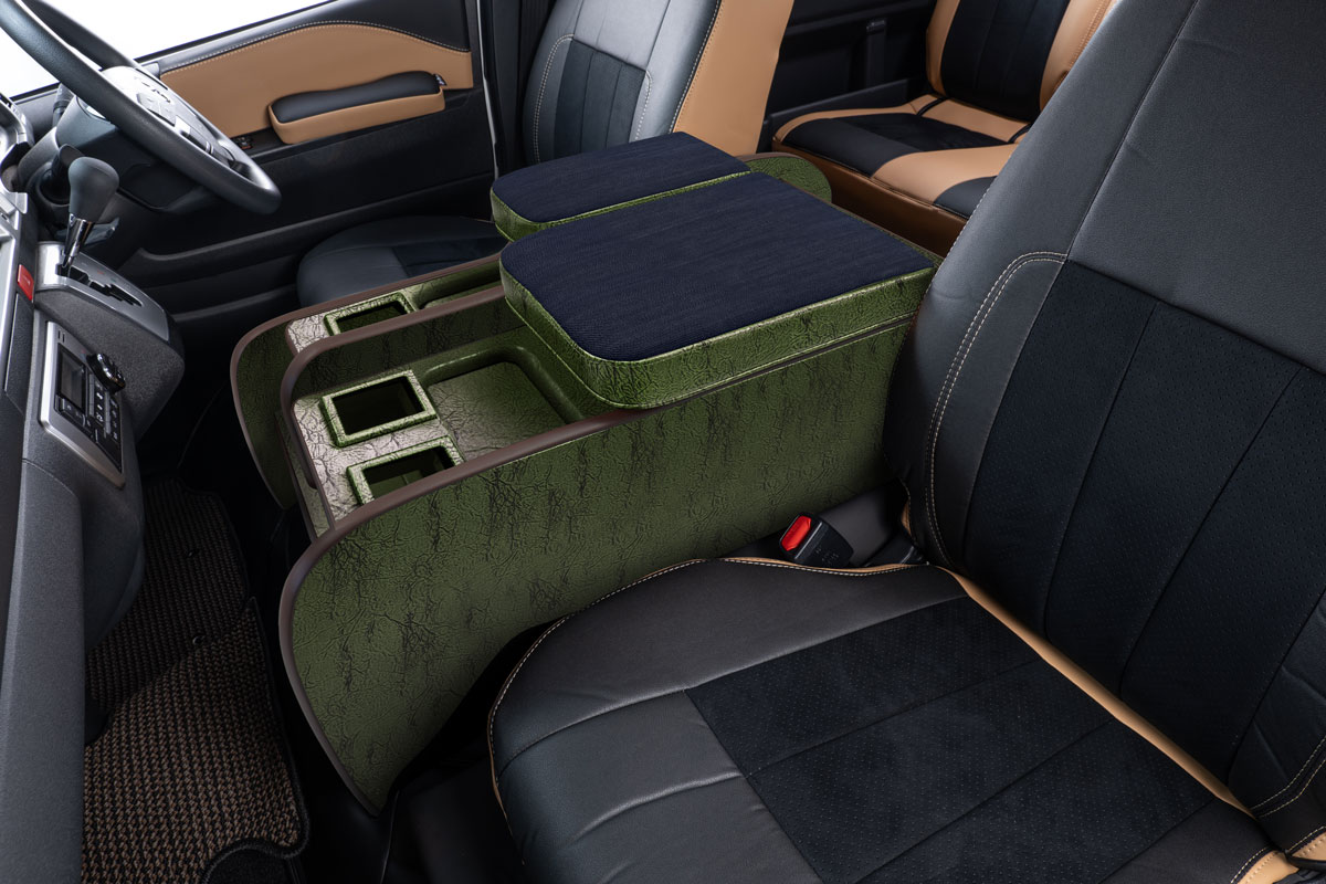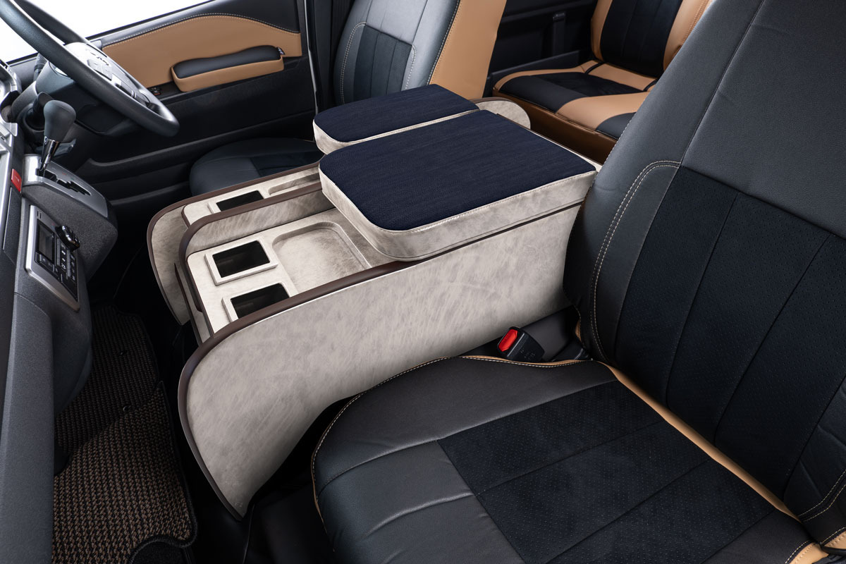 ハイエース用のシートカバープライムシリーズと一緒に装着されているセンターコンソールプライム。 ハイエース用のシートカバープライムシリーズと一緒に装着されているセンターコンソールプライム。