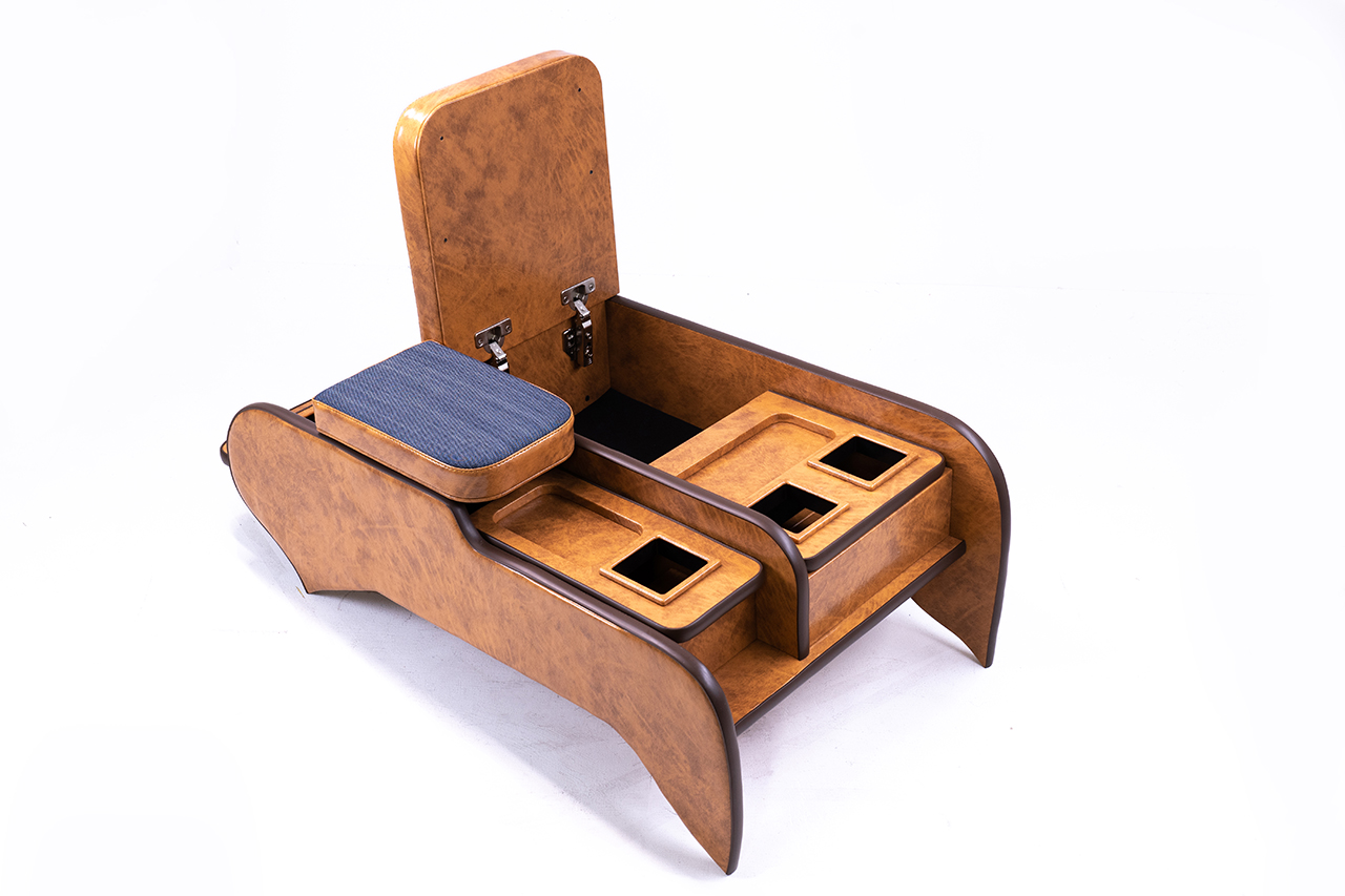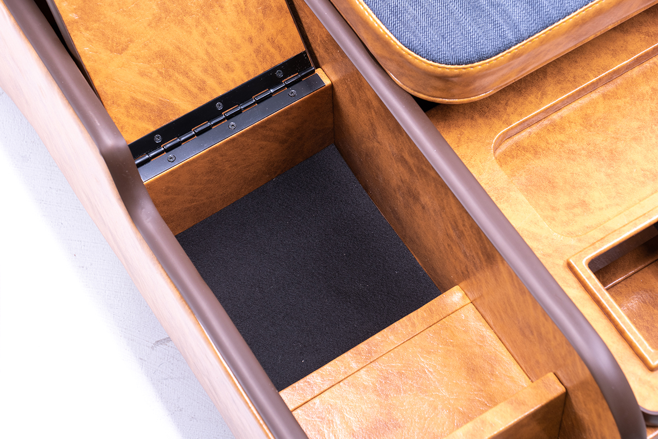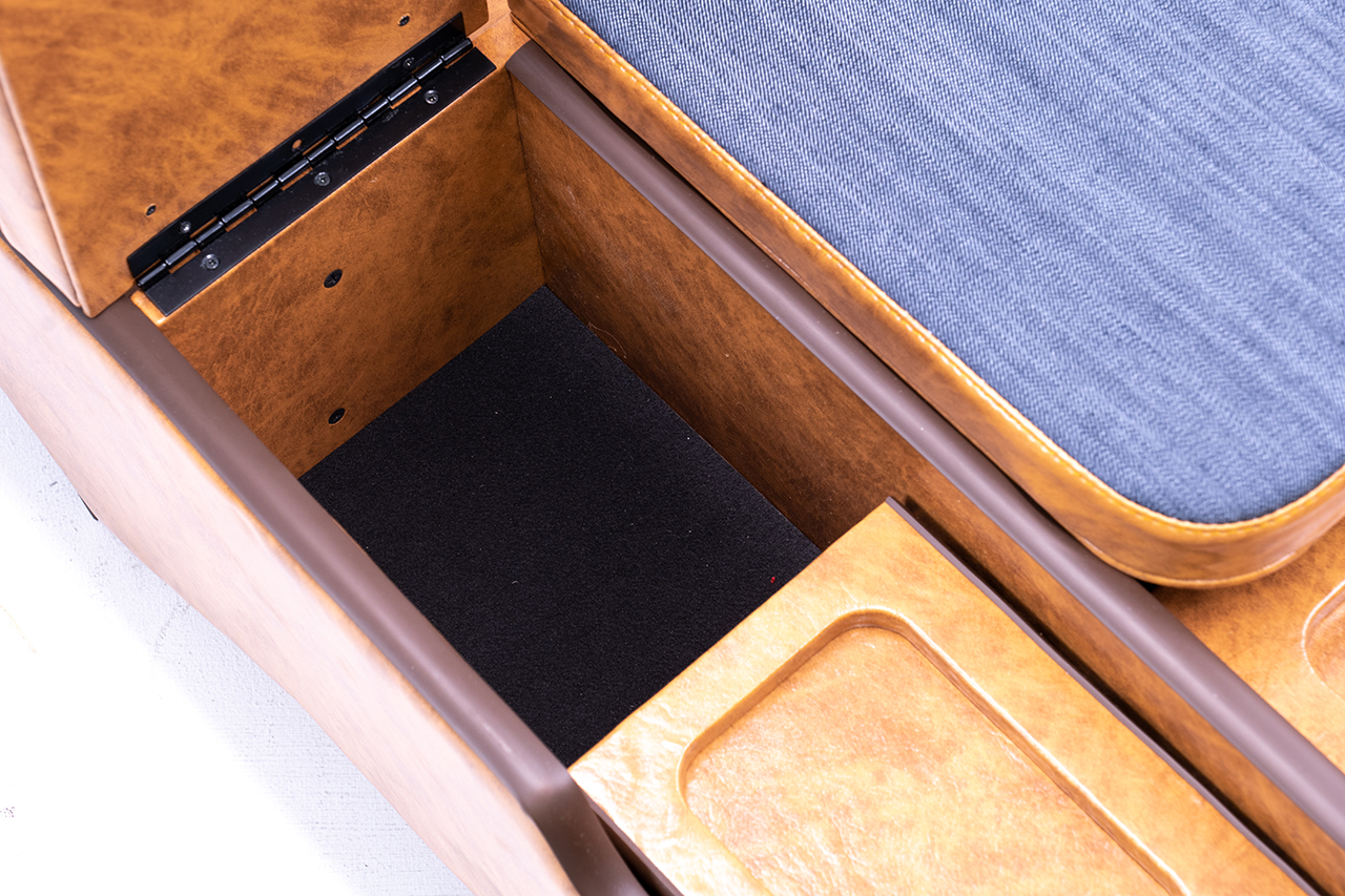 収納の蓋の役目を担ったアームレストは運転席助手席ともに使用可能で、天面にはウレタンクッションを内包。肘を置いたときの使い心地に配慮した設計です。