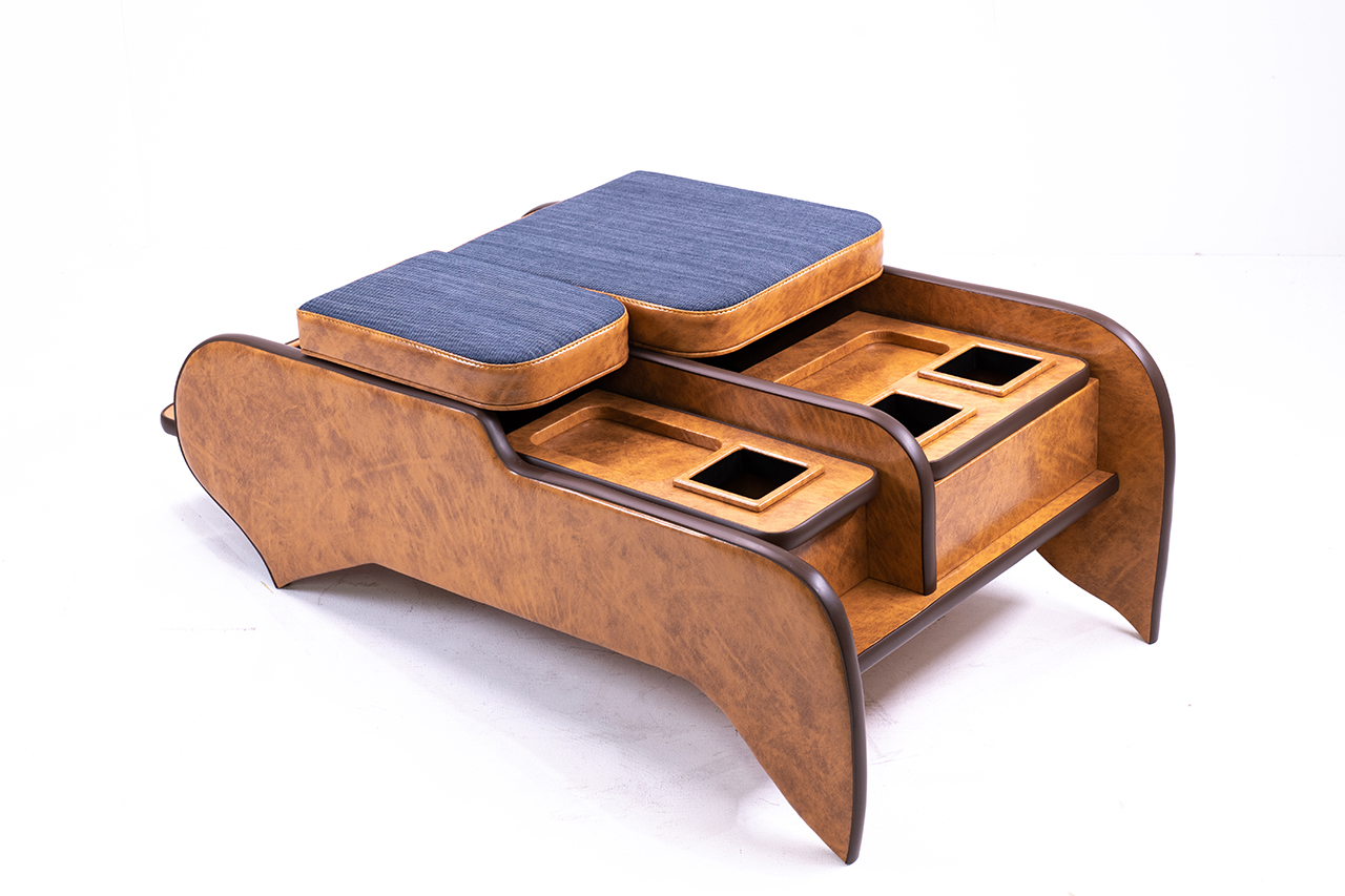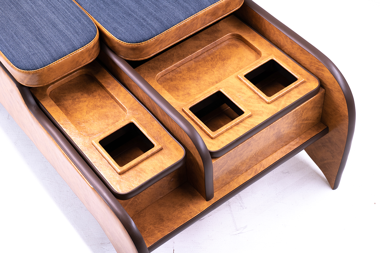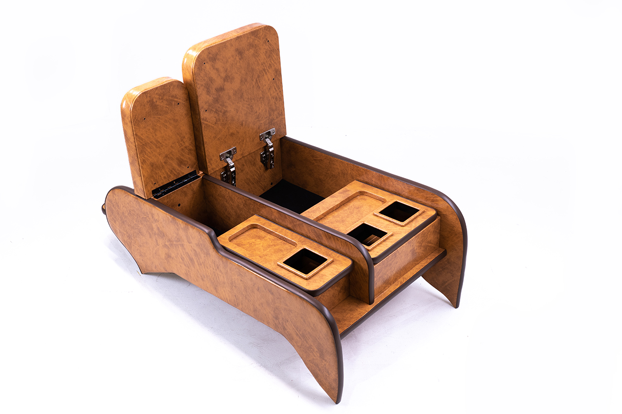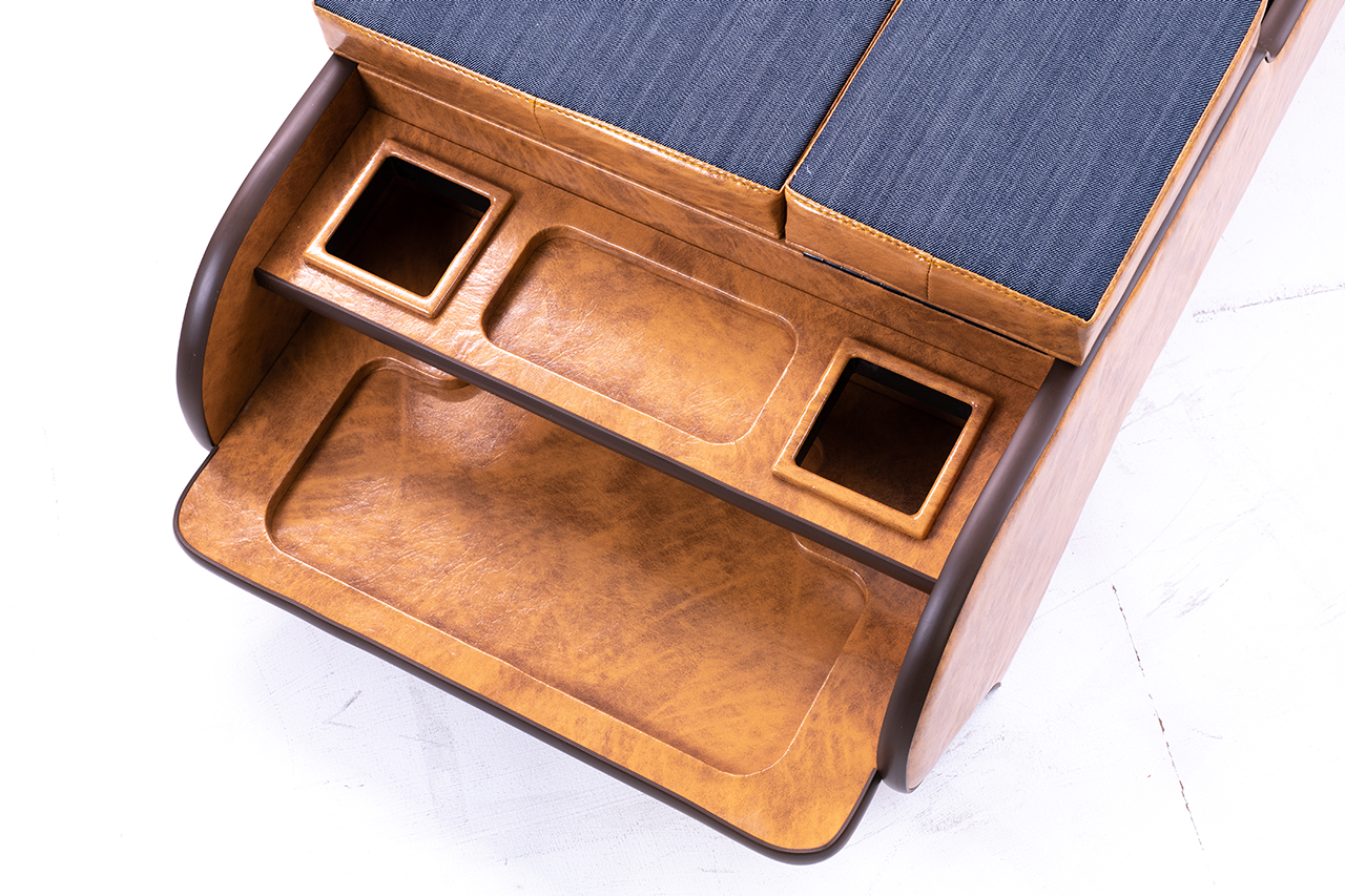 純正コンソールに用意されたドリンクホルダー2箇所に加え、小物トレーを追加設計しました。
