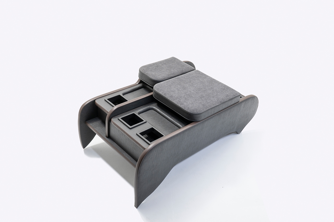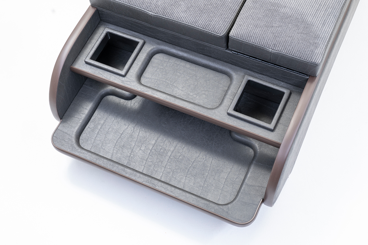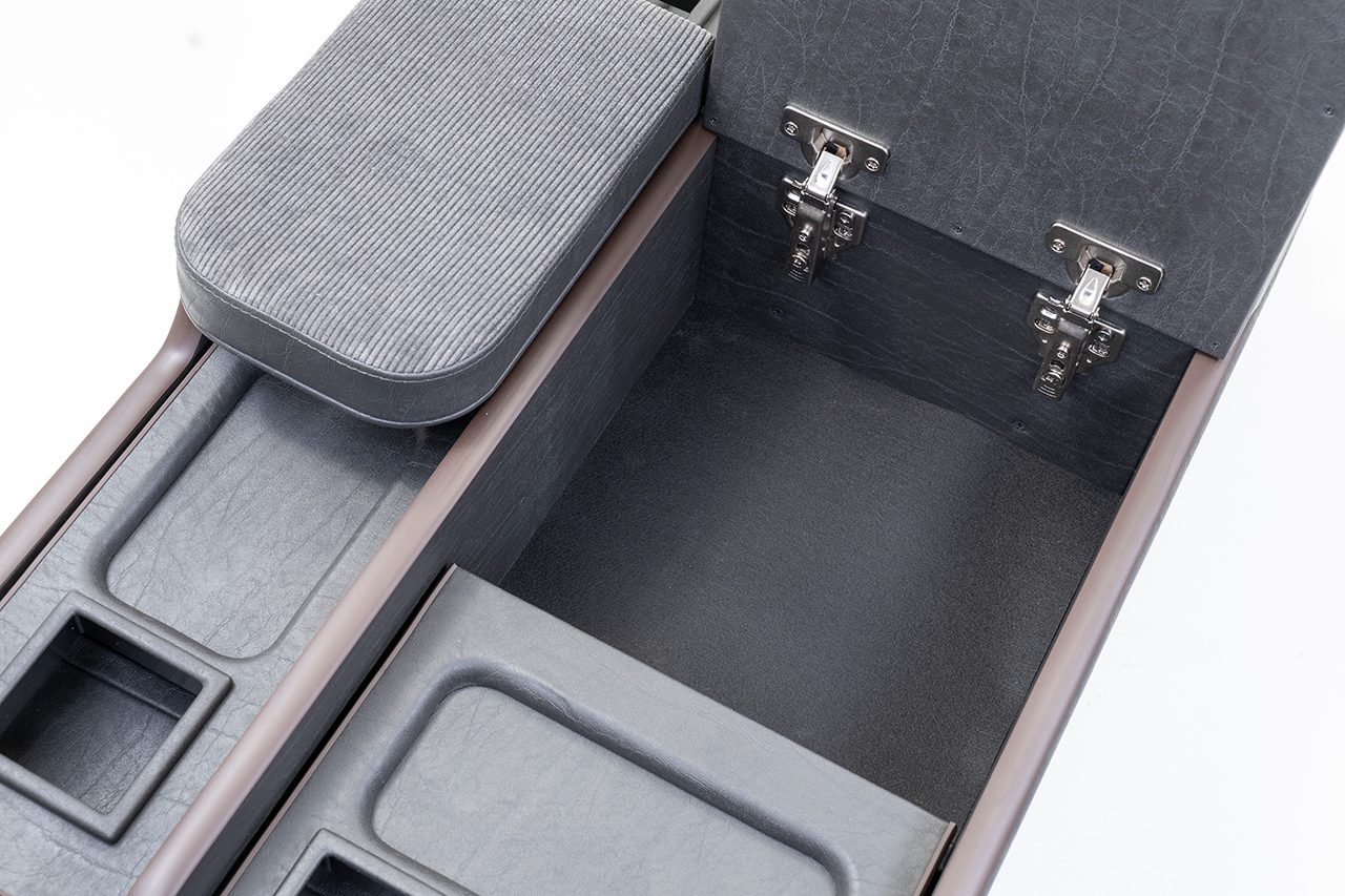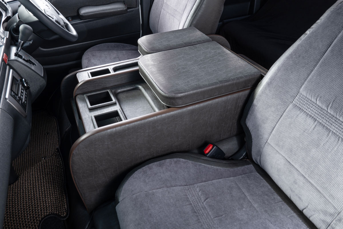 収納の蓋の役目を担ったアームレストは運転席助手席ともに使用可能で、天面にはウレタンクッションを内包。肘を置いたときの使い心地に配慮した設計です。