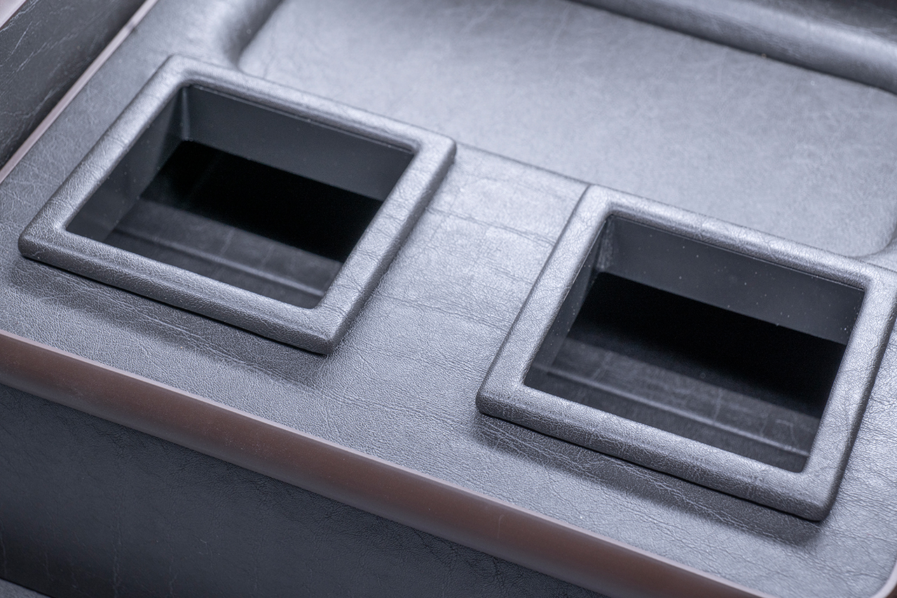 純正コンソールに用意されたドリンクホルダー2箇所に加え、小物トレーを追加設計しました。