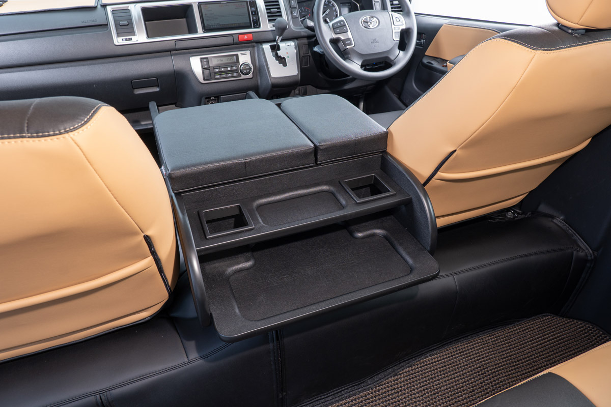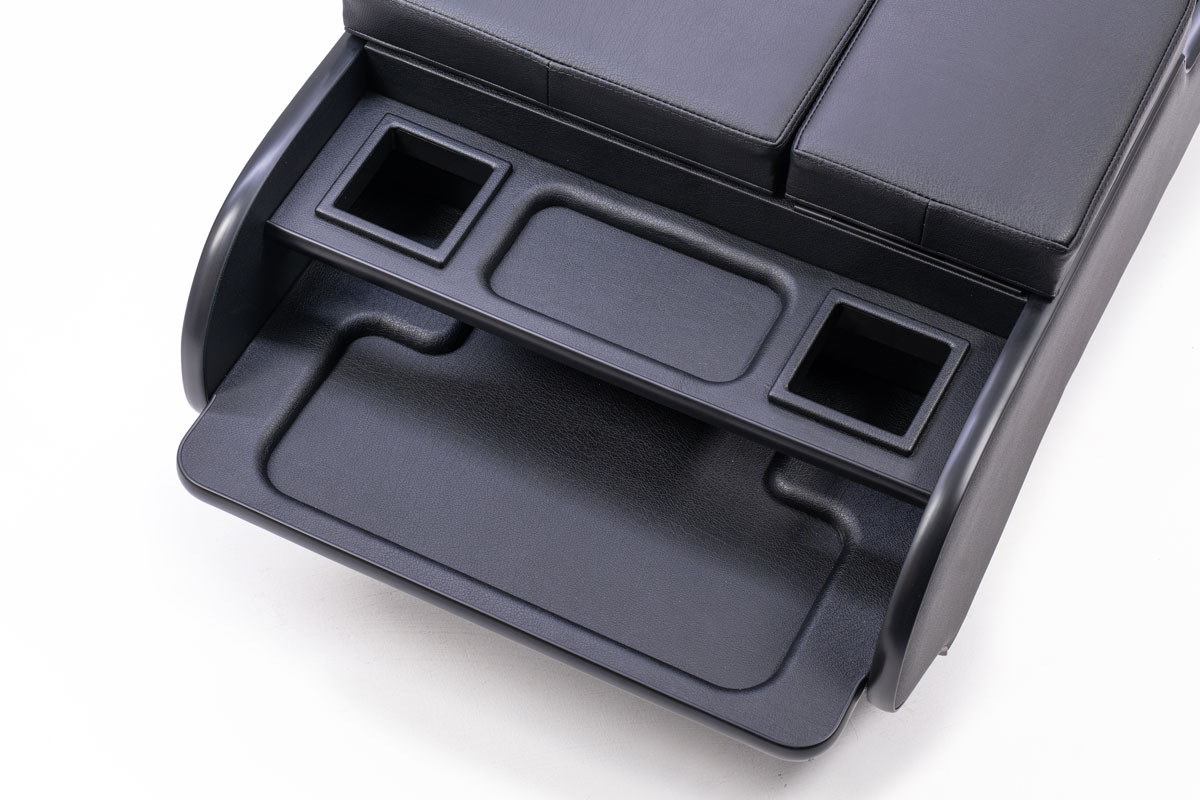 純正コンソールに用意されたドリンクホルダー2箇所に加え、小物トレーを追加設計しました。