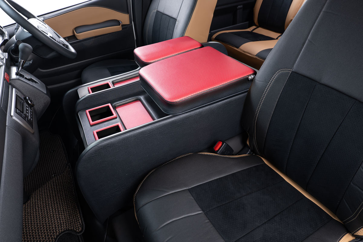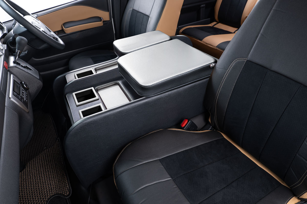 収納の蓋の役目を担ったアームレストは運転席助手席ともに使用可能で、天面にはウレタンクッションを内包。肘を置いたときの使い心地に配慮した設計です。