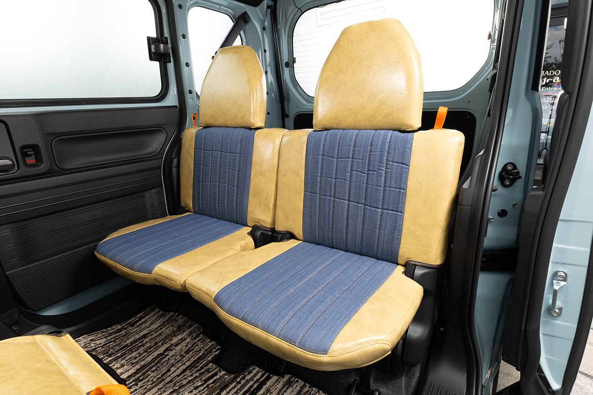 ジムニー後部座席に装着したアンティークデニム アンティークキャメルカラー。