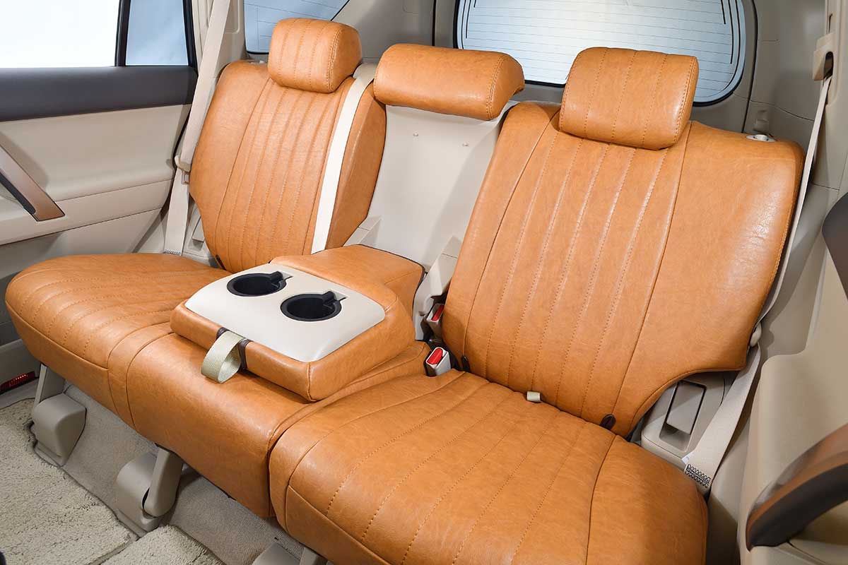 150PRADO後部座席装着イメージ。プラドの様な複雑な形状のシートにも見事にフィットする様にデザイン。