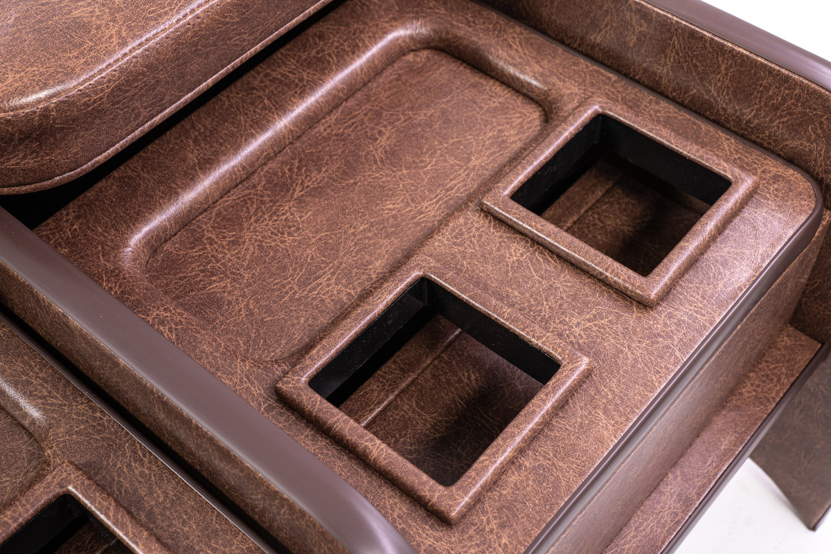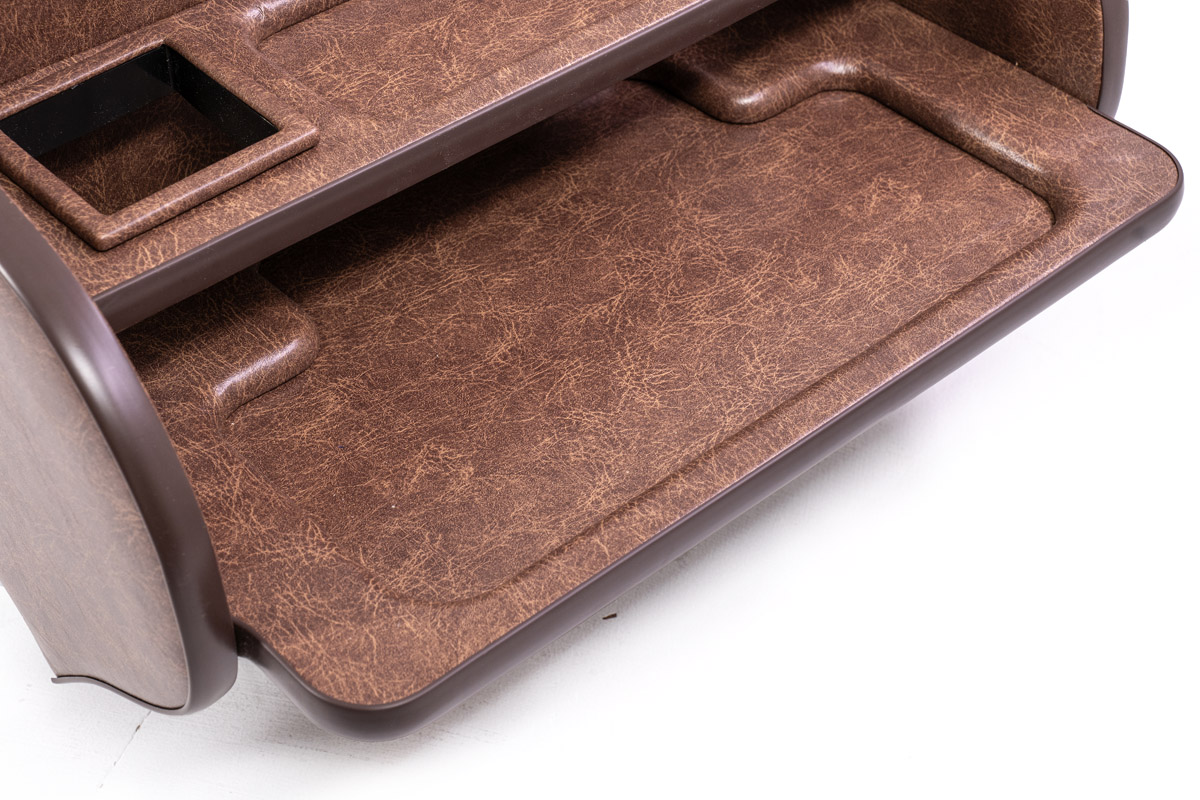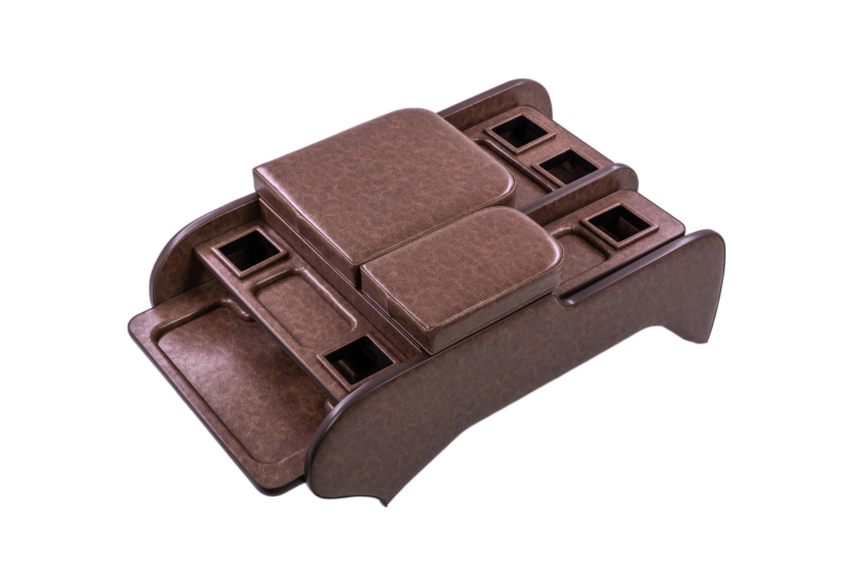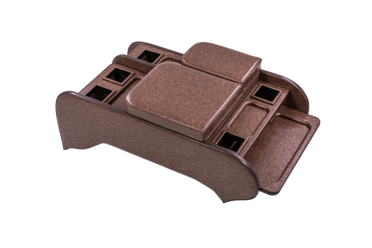純正コンソールに用意されたドリンクホルダー2箇所に加え、小物トレーを追加設計しました。