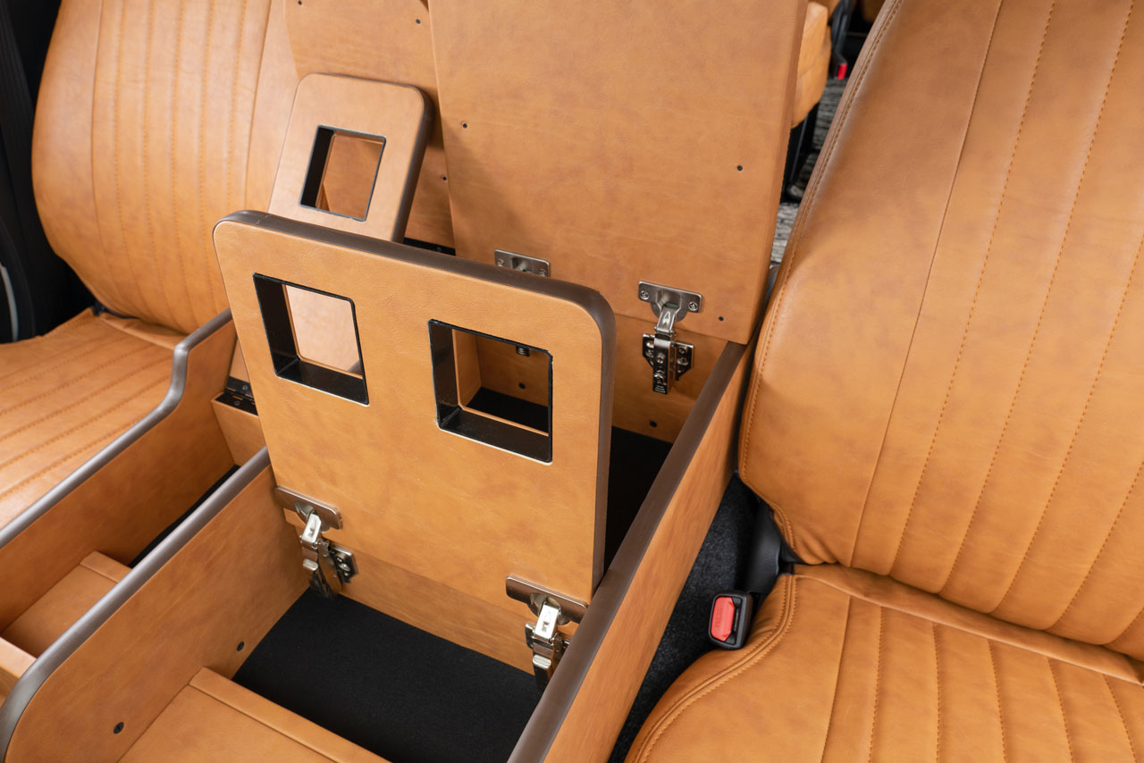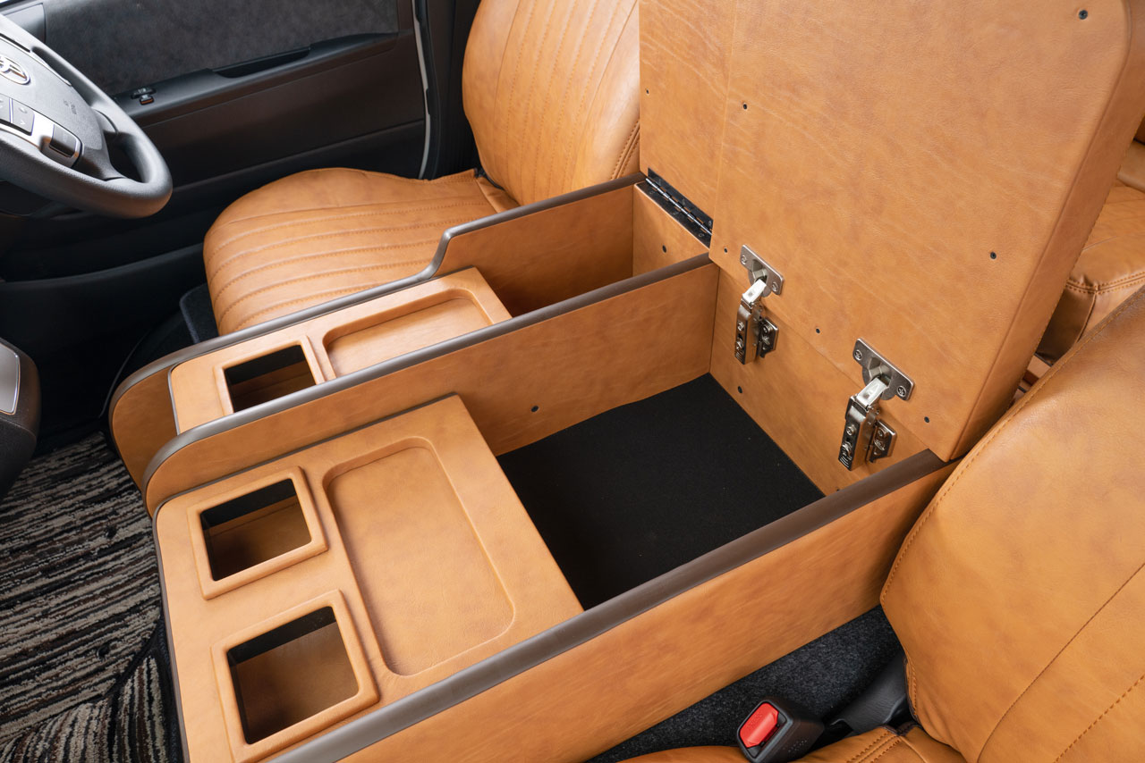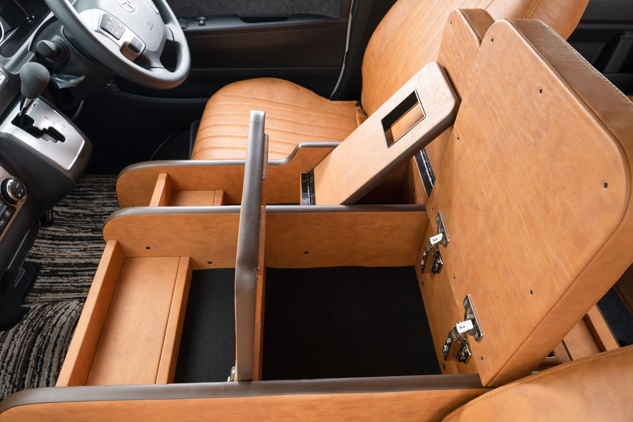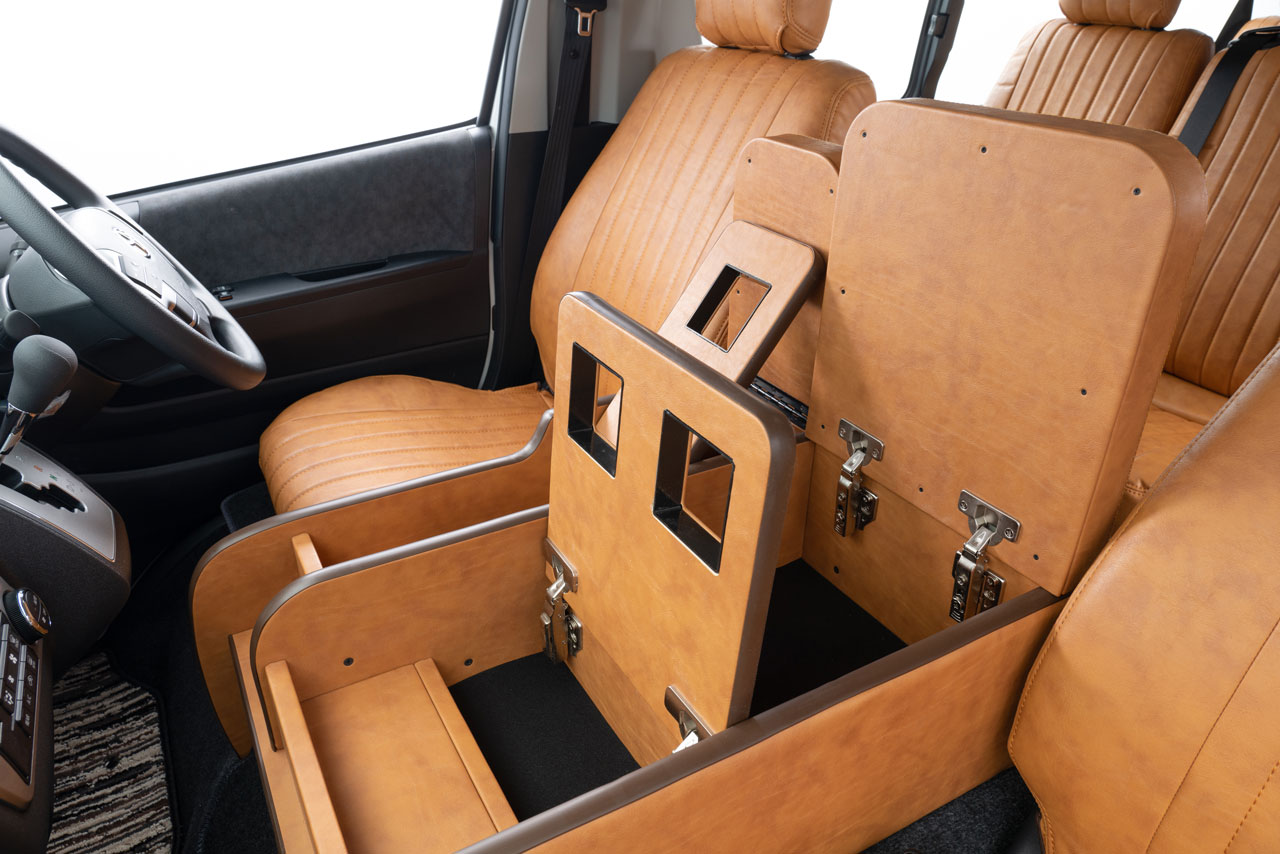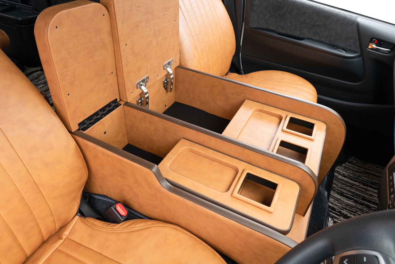 収納の蓋の役目を担ったアームレストは運転席助手席ともに使用可能で、天面にはウレタンクッションを内包。肘を置いたときの使い心地に配慮した設計です。