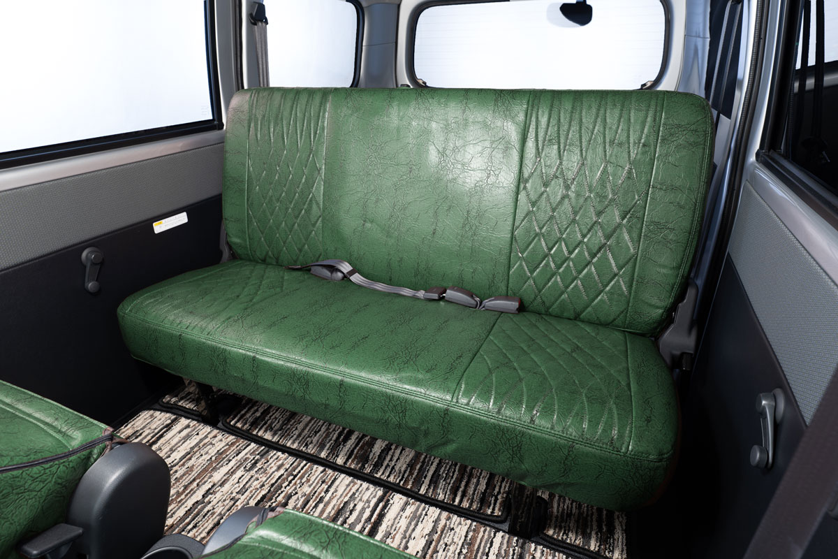 ジムニーJB64に装着したアンティークデザインD キャメルカラー。ジムニーの後部座席座面は一体式なので、カバーも合わせて設計されています。