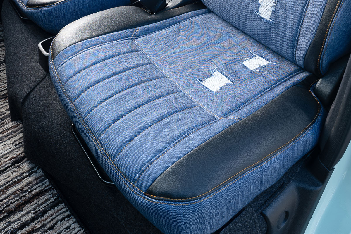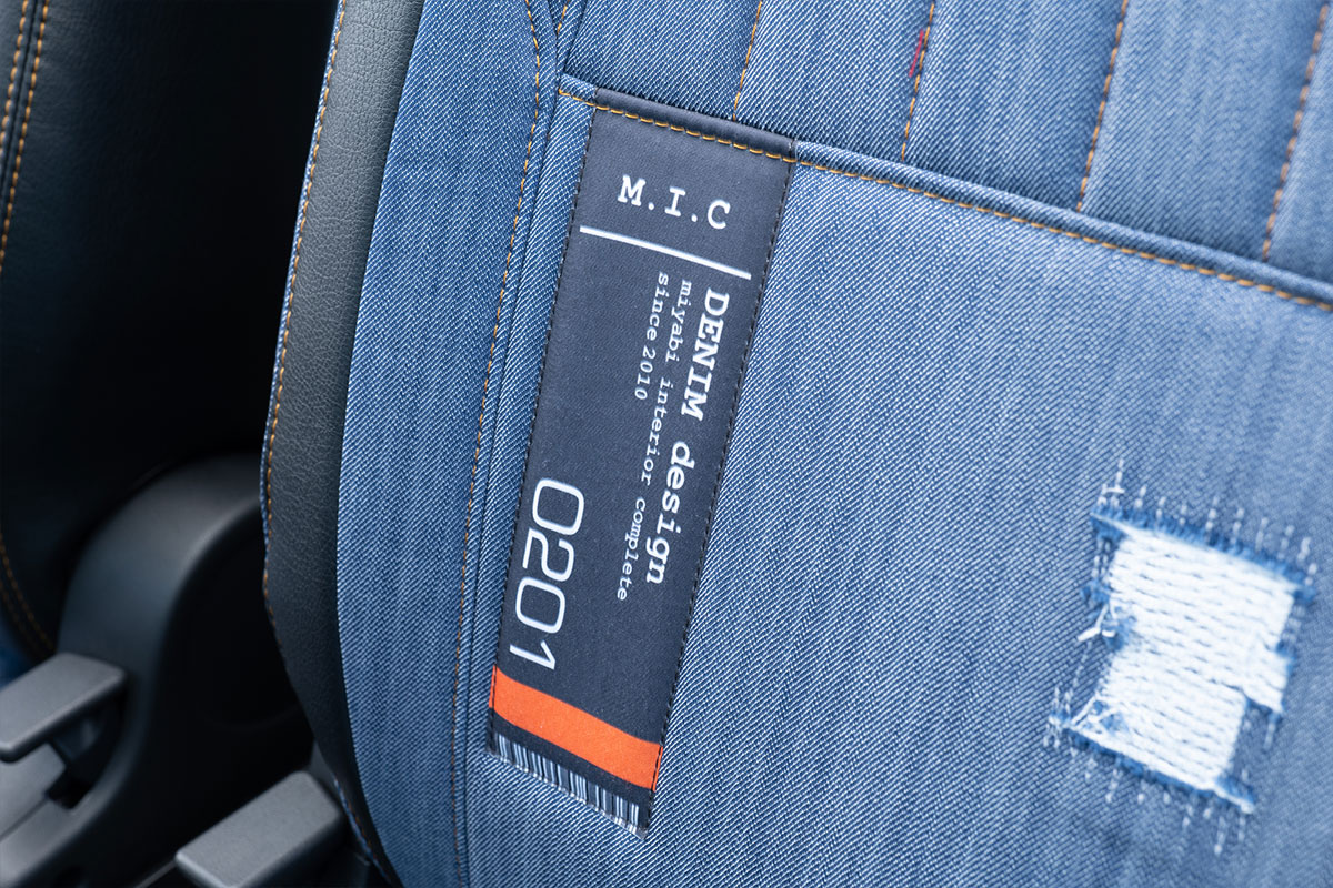シート背もたれ部分にはエムアイシーデニムタグをデザイン。