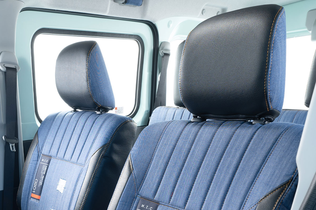 ジムニー運転席・助手席に装着したM.I.C DENIMシートカバー インディゴブルー 背面デザイン(※別売ヘッドレストポケットV2装着)