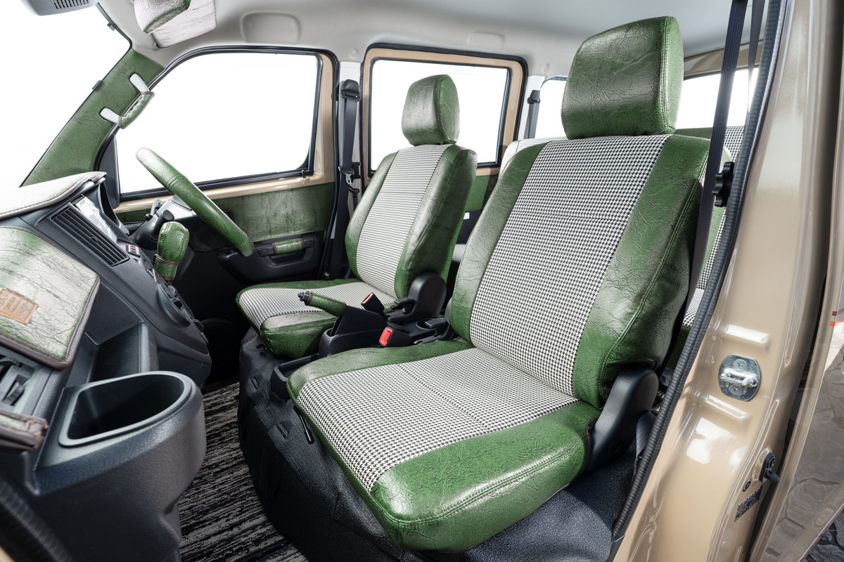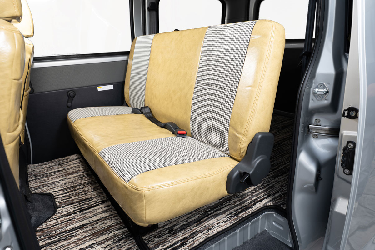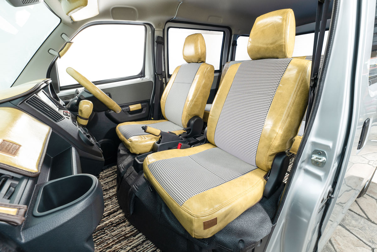 人気シートカバーシリーズ、アンティークに千鳥織生地を組み合わせた