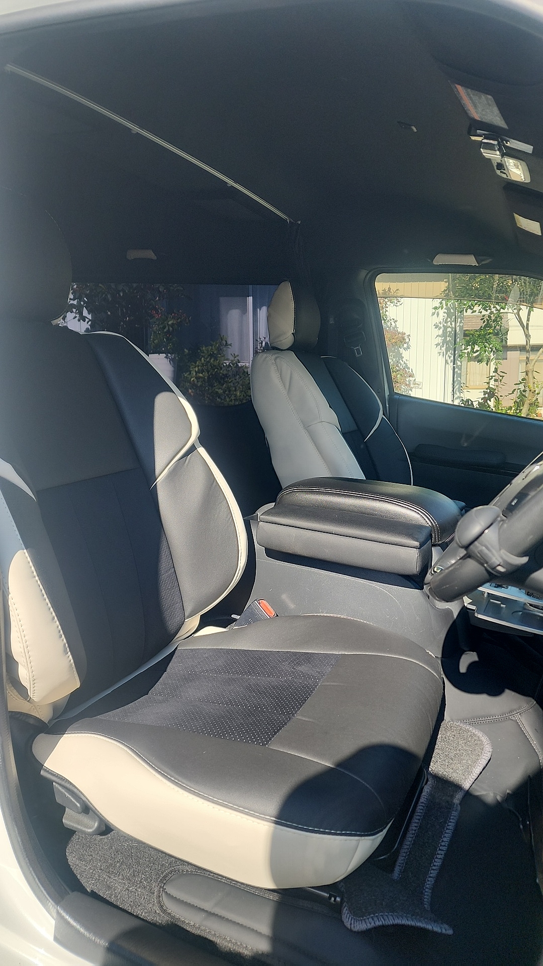 ノーマルタイプのカバーにはシート元の形状にピッタリとフィットするように設計。純正形状の使用感に高級レザーの触り心地がプラスされた使用感。ハイエースのシンプルなシート形状のままに贅沢な雰囲気を演出します。