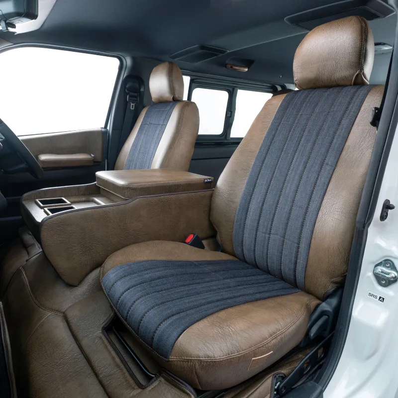 200系ハイエースバンに装着したキャメルカラー。インディゴブルーとの組み合わせがバランスよくまとまったデザイン。